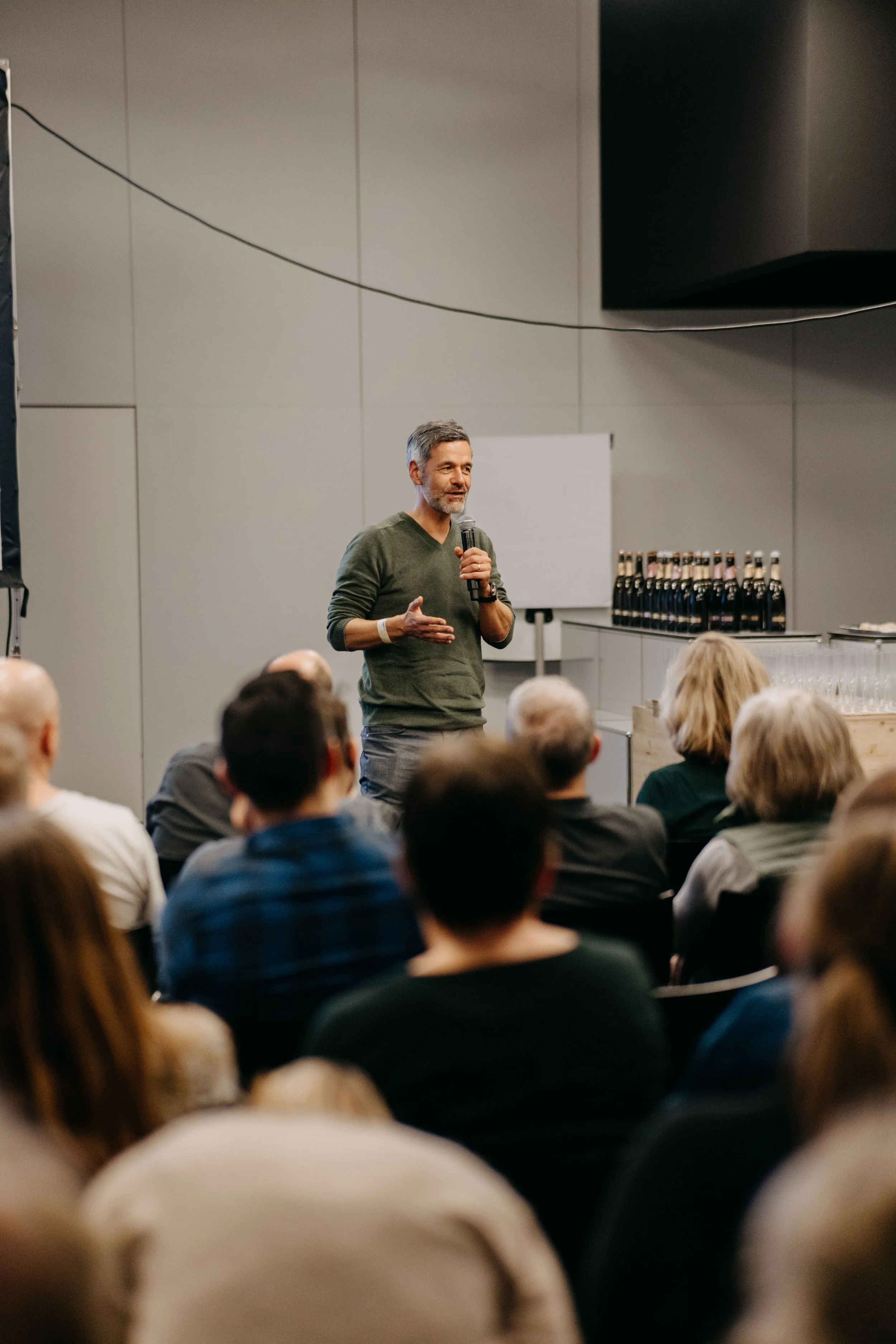 Ein Mann hält eine Rede vor einem Publikum in einem Veranstaltungsraum, im Hintergrund stehen Flaschen und Gläser.