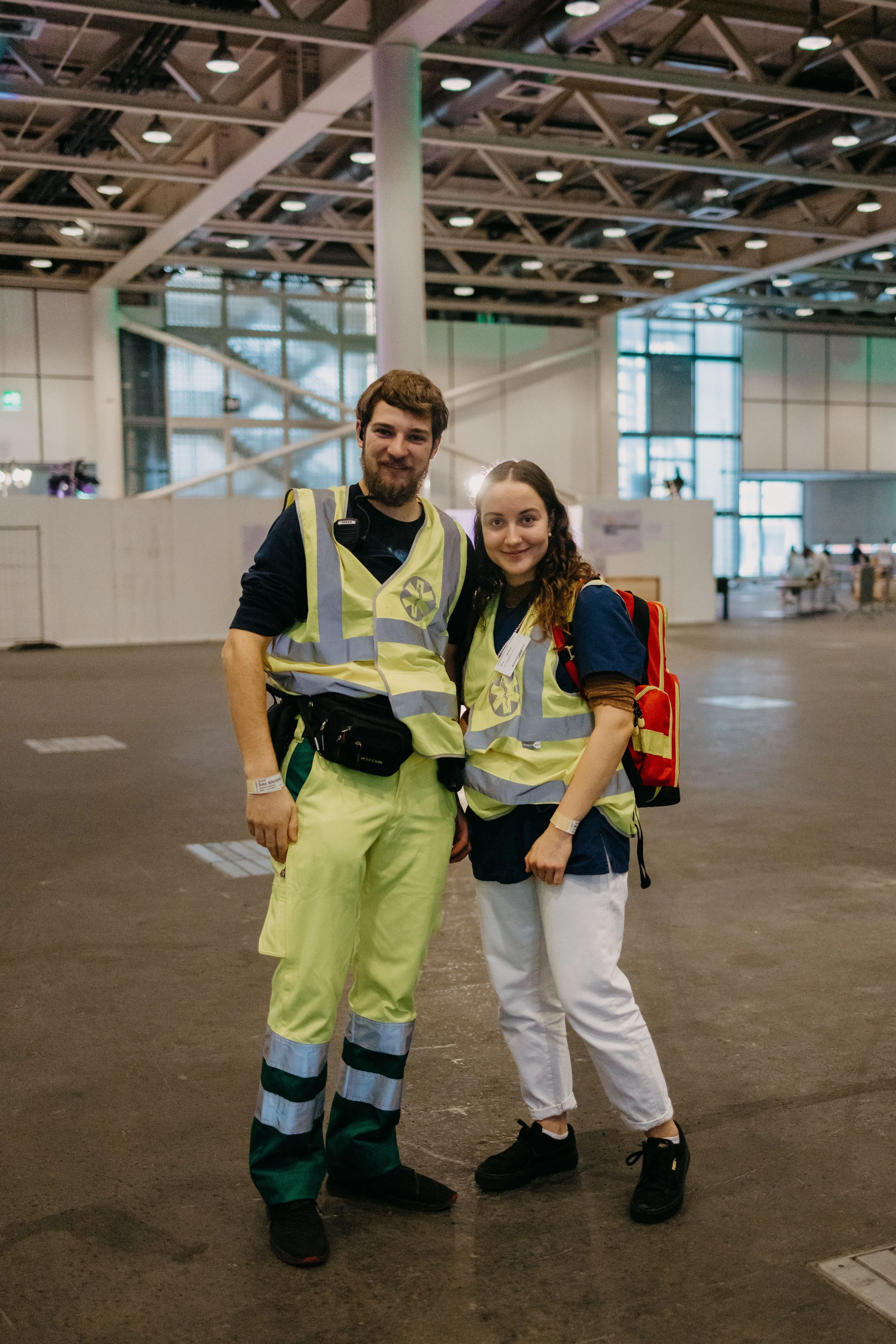 Zwei Rettungskräfte in Fluorescezierwesten stehen im Innenraum eines Gebäudes, vermutlich bei einer Veranstaltung oder in einem Notfallbereich, und posieren für das Foto.