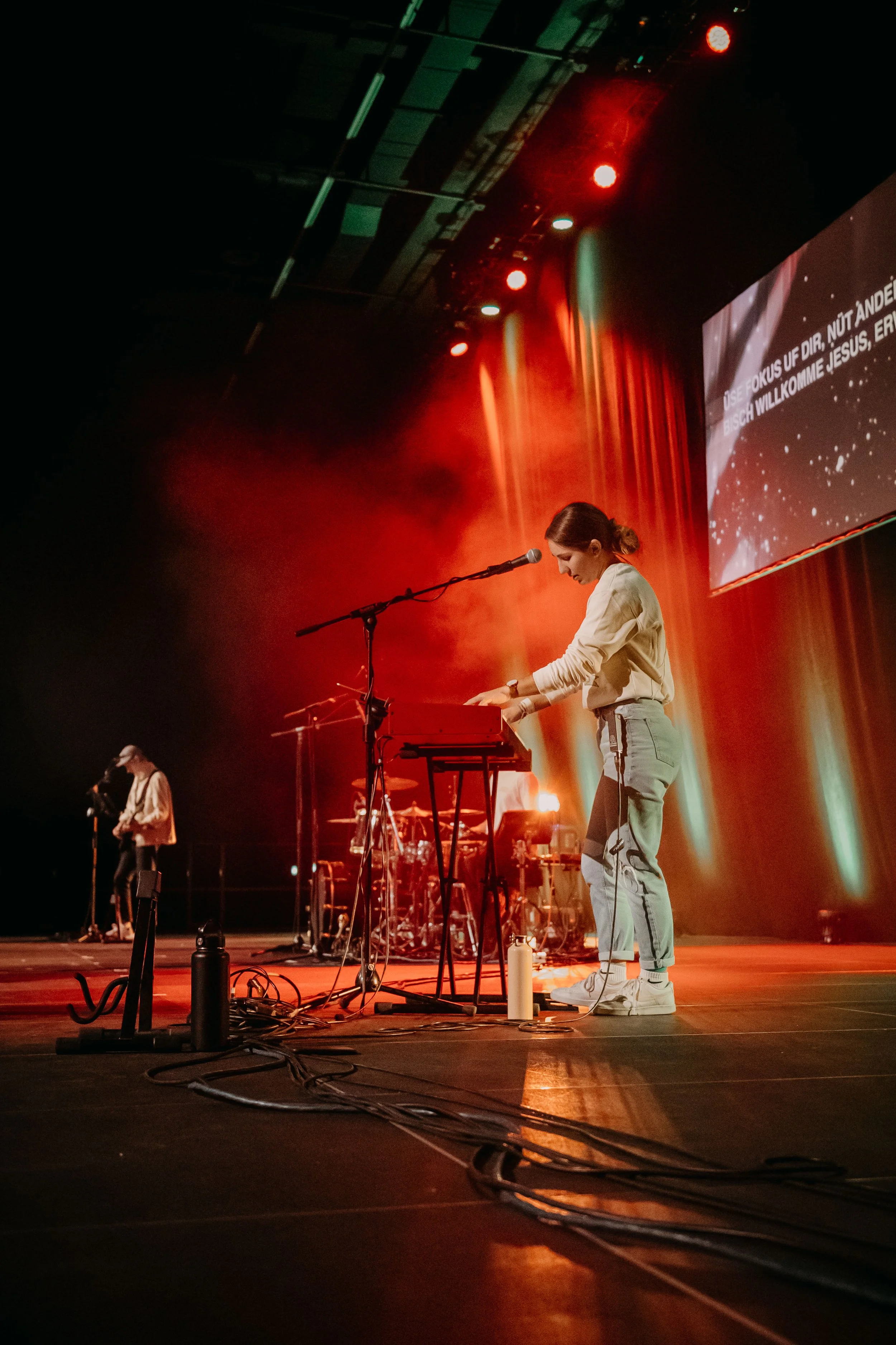 Musikerin spielt auf einer Bühne mit rotem Licht, im Hintergrund sind Schlagzeug und eine große Leinwand mit Text in Deutsch.