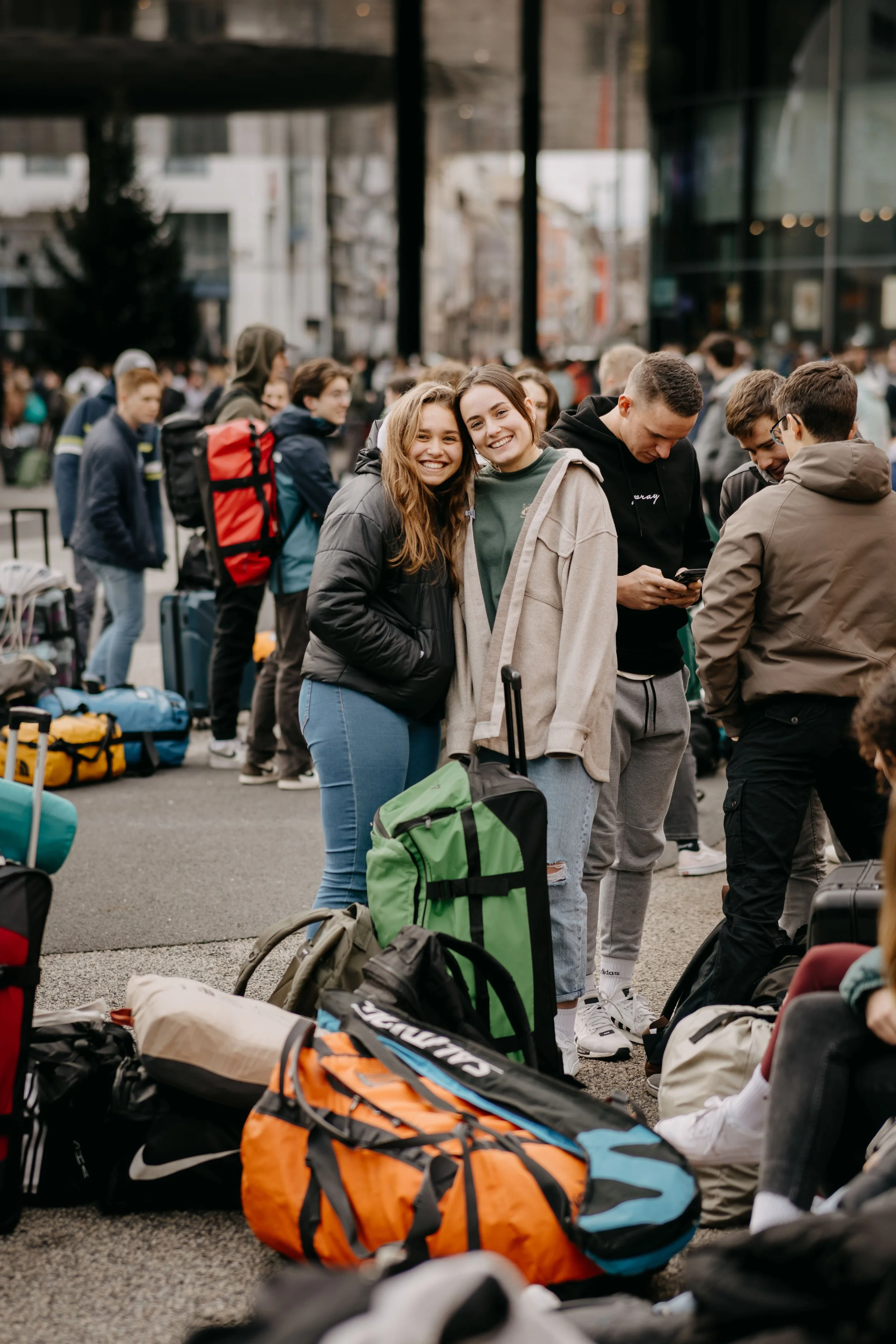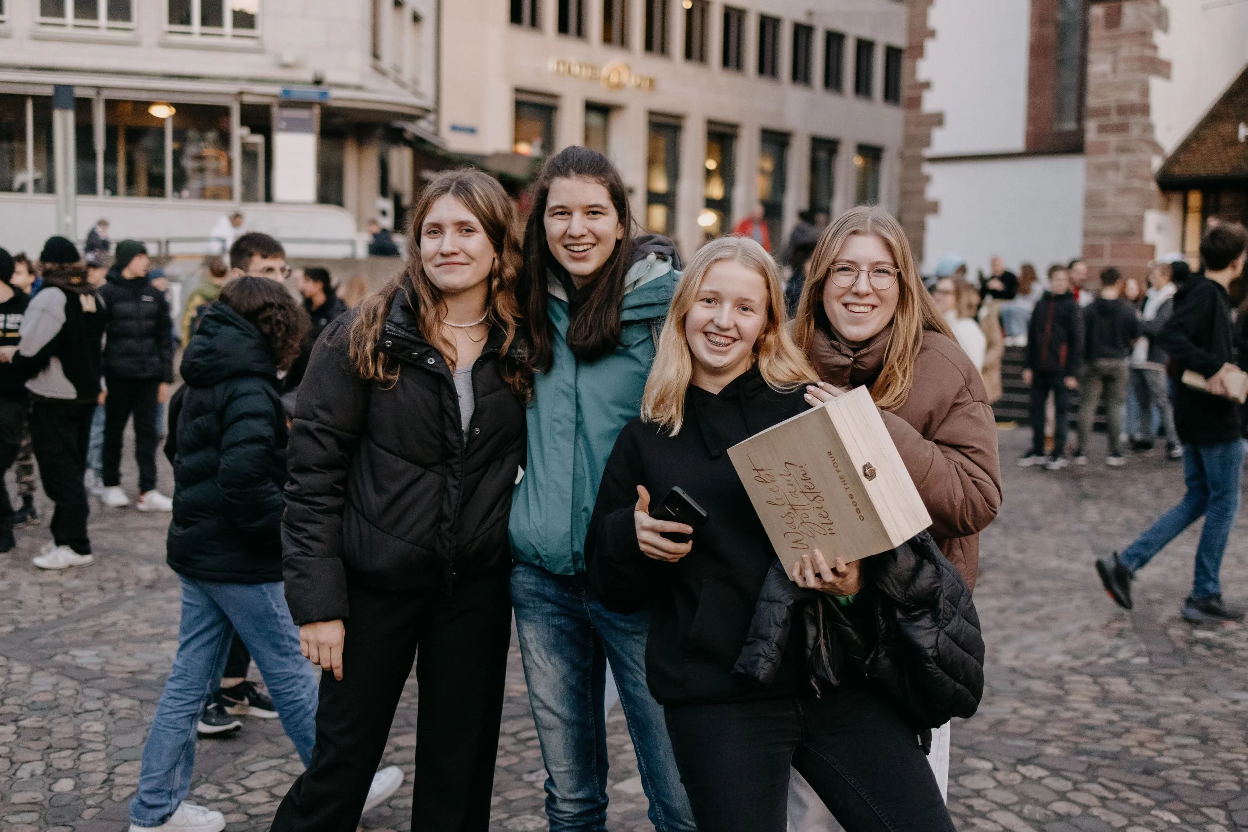 Gruppe junger Frauen lächelt in einer belebten Stadt. Sie tragen Winterjacken, einige halten ein Buch und ein Smartphone. Im Hintergrund sind andere Menschen und alte Gebäude sichtbar.