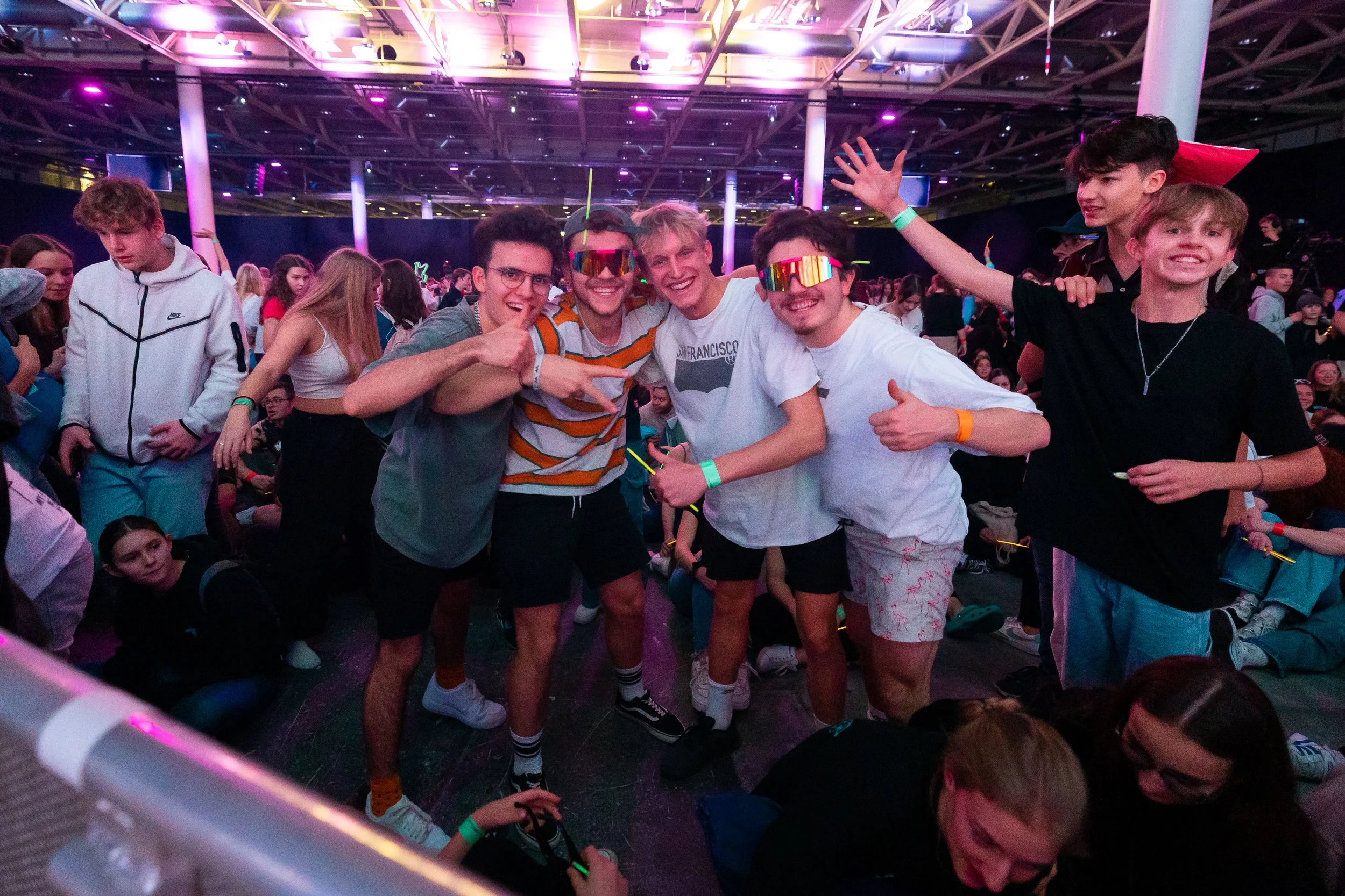 Gruppe junger Menschen beim Festival mit Neonlicht, lachend und posierend.