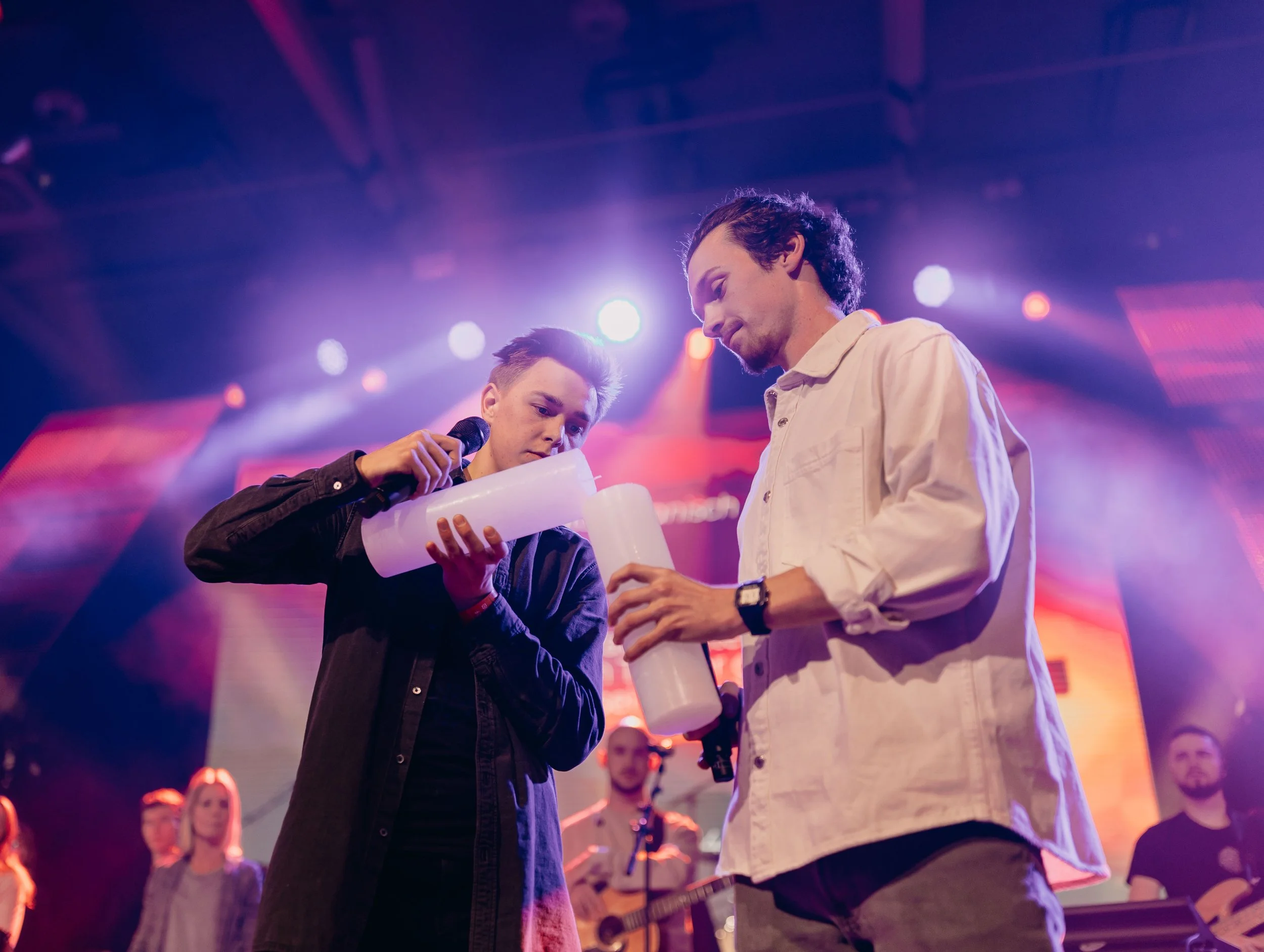 Zwei junge Männer lachen und interagieren auf einer Bühne, einer hält ein Mikrofon, im Hintergrund bunte Bühnenbeleuchtung und Nebel.