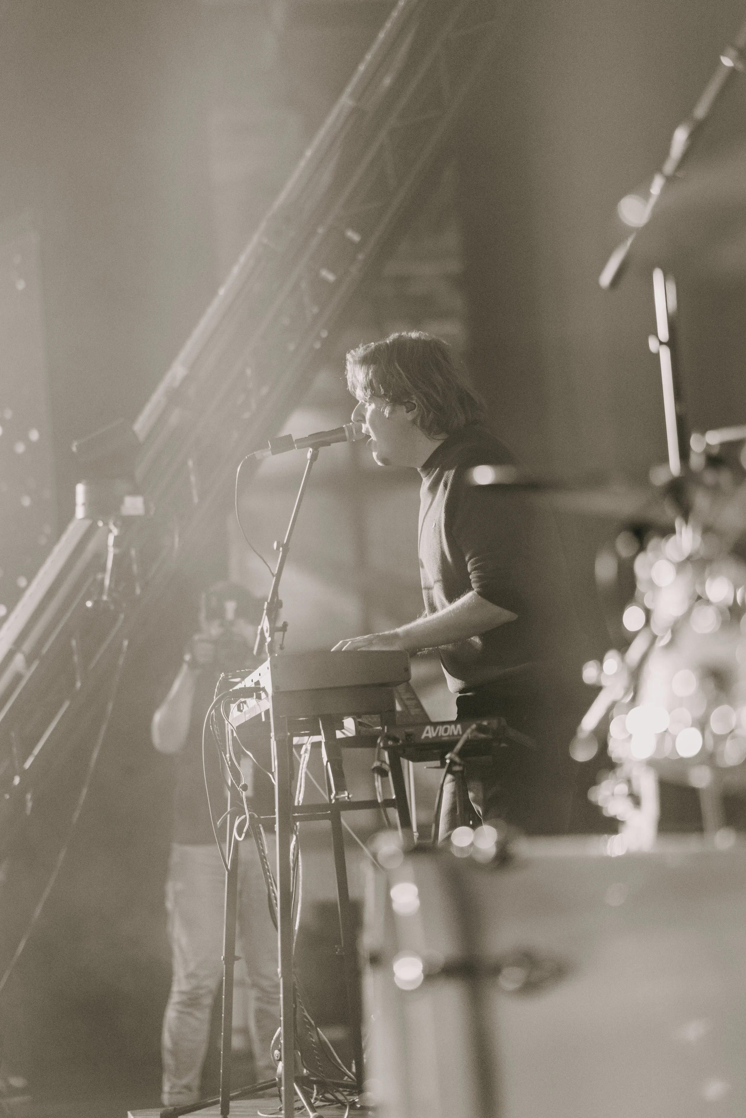 Musiker spielt auf einem Keyboard bei einem Live-Konzert, schwarz-weiß Fotografie.