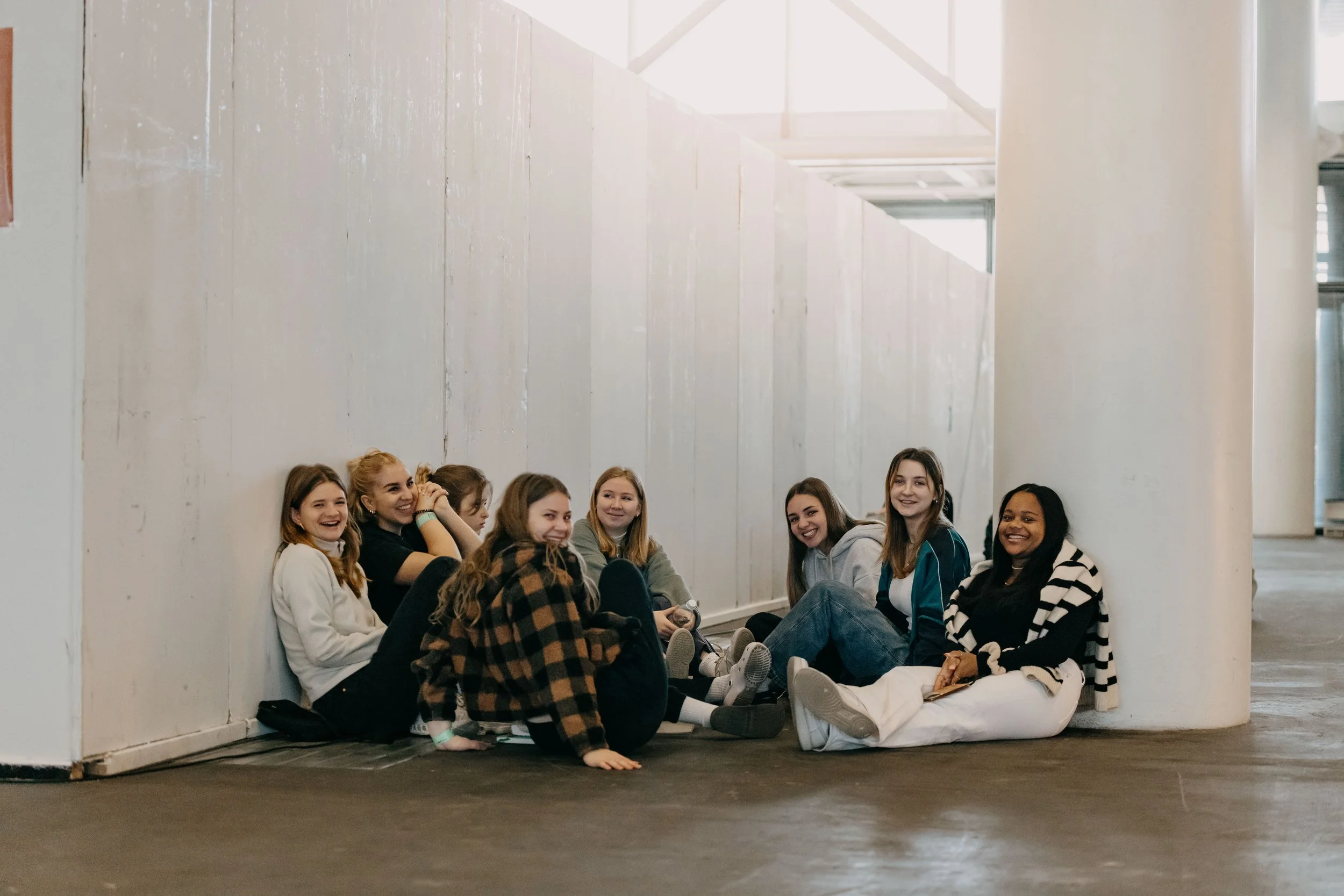 Eine Gruppe junger Frauen sitzt lachend an einer weißen Wand in einem modernen, offenen Gebäude.
