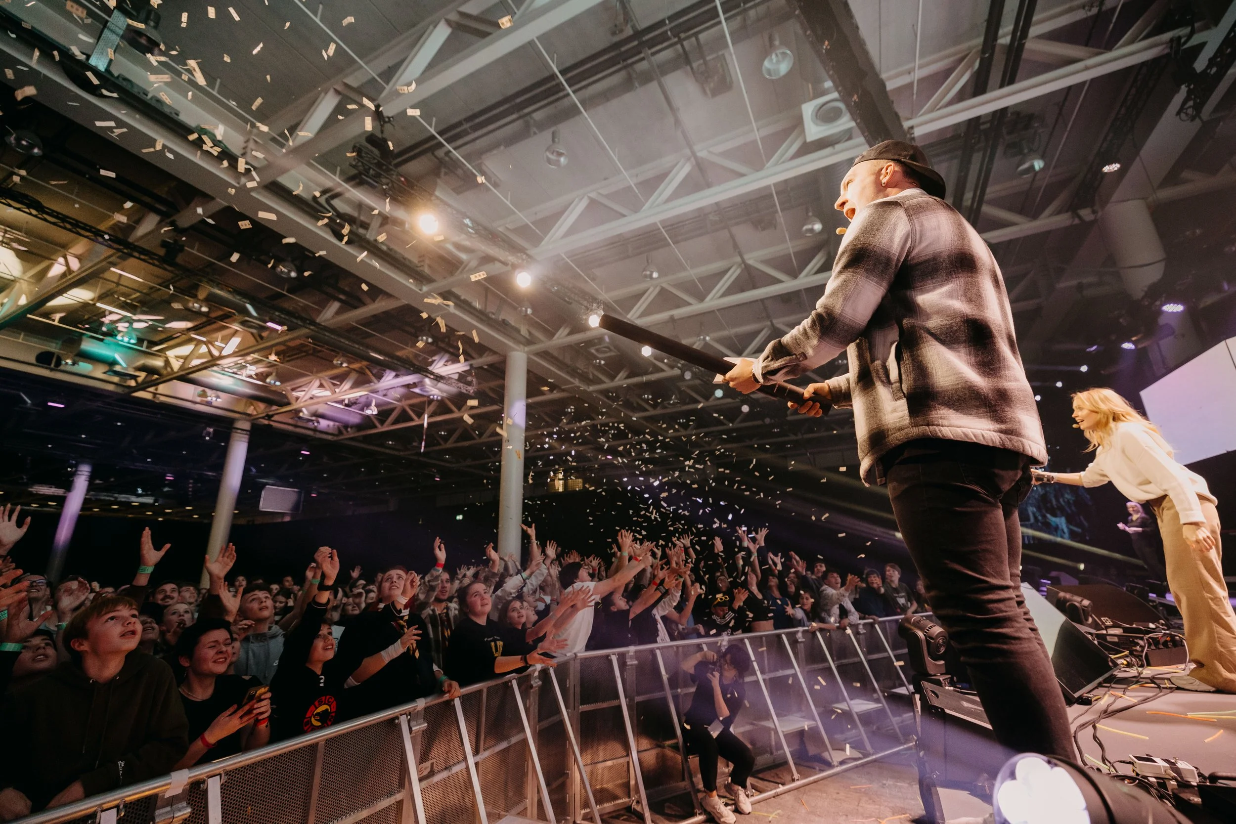 Ein Musiker spielt mit einem Mikrofon auf der Bühne vor einem enthusiastischen Publikum, das jubelt und cheerleaderartige Bewegungen macht, während Konfetti fliegt.