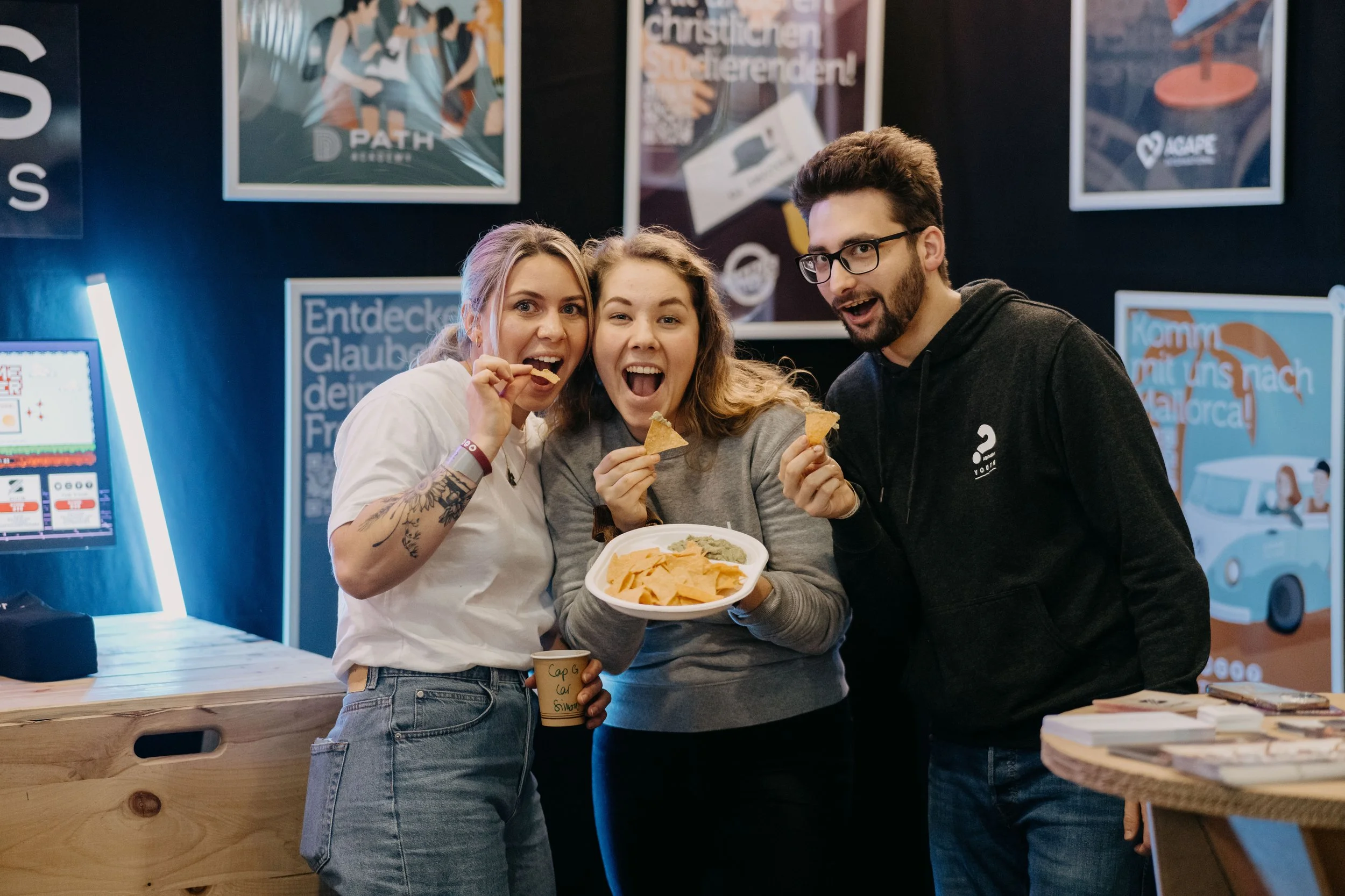 Drei junge Erwachsene feiern fröhlich mit Chips und Dip in einer dunklen Indoor-Umgebung, umgeben von bunten Postern und Displays.