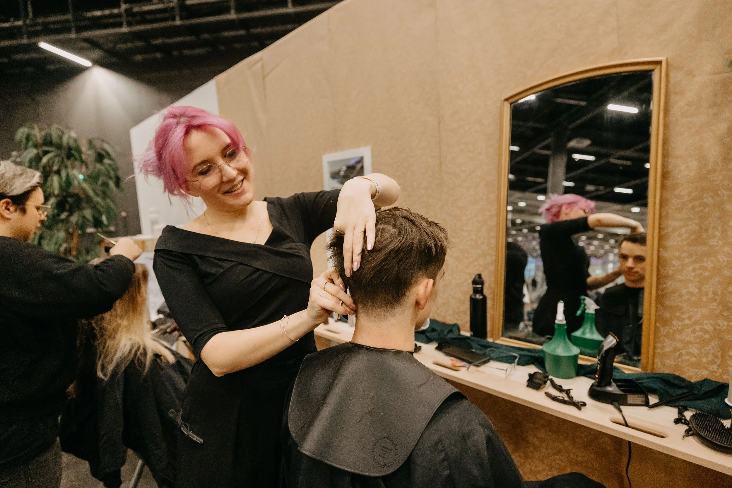 Friseurin schneidet die Haare eines Kunden im Salon, im Hintergrund eine weitere Friseurin, die an einer anderen Kundin arbeitet.