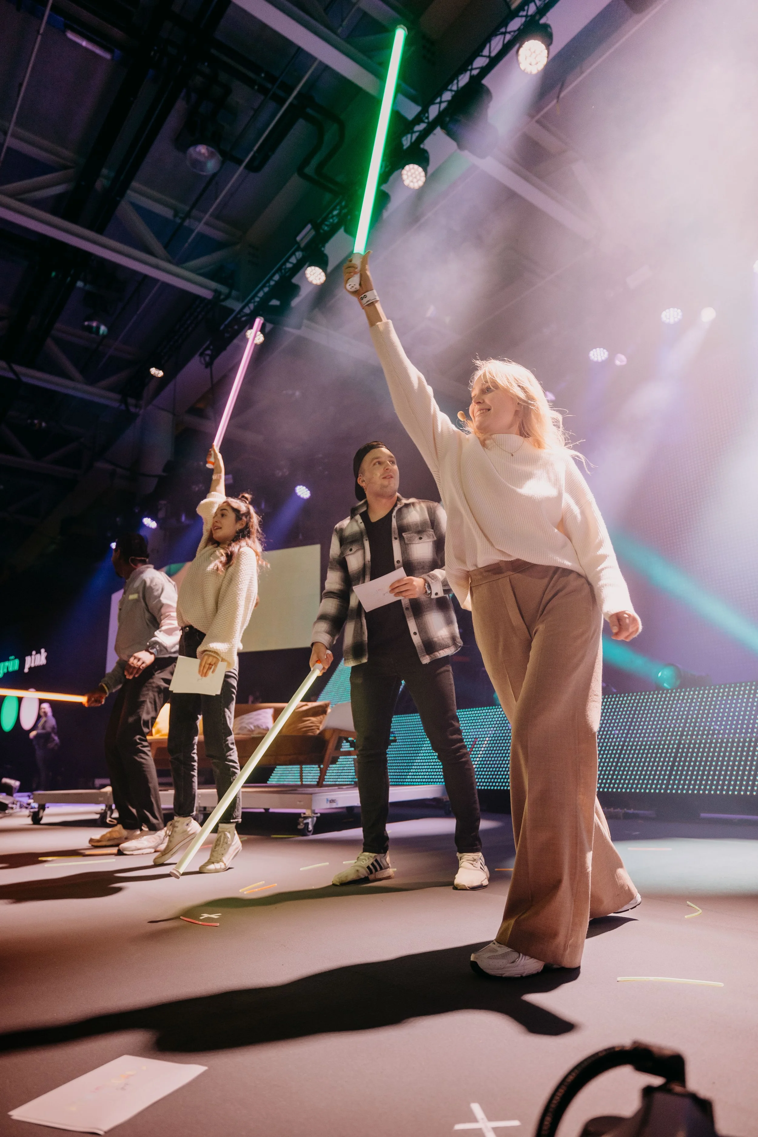 Menschen auf einer Bühne, die leuchtende Stäbe halten, während sie an einer Veranstaltung teilnehmen, mit bunten Lichtern und einer großen LED-Leinwand im Hintergrund.