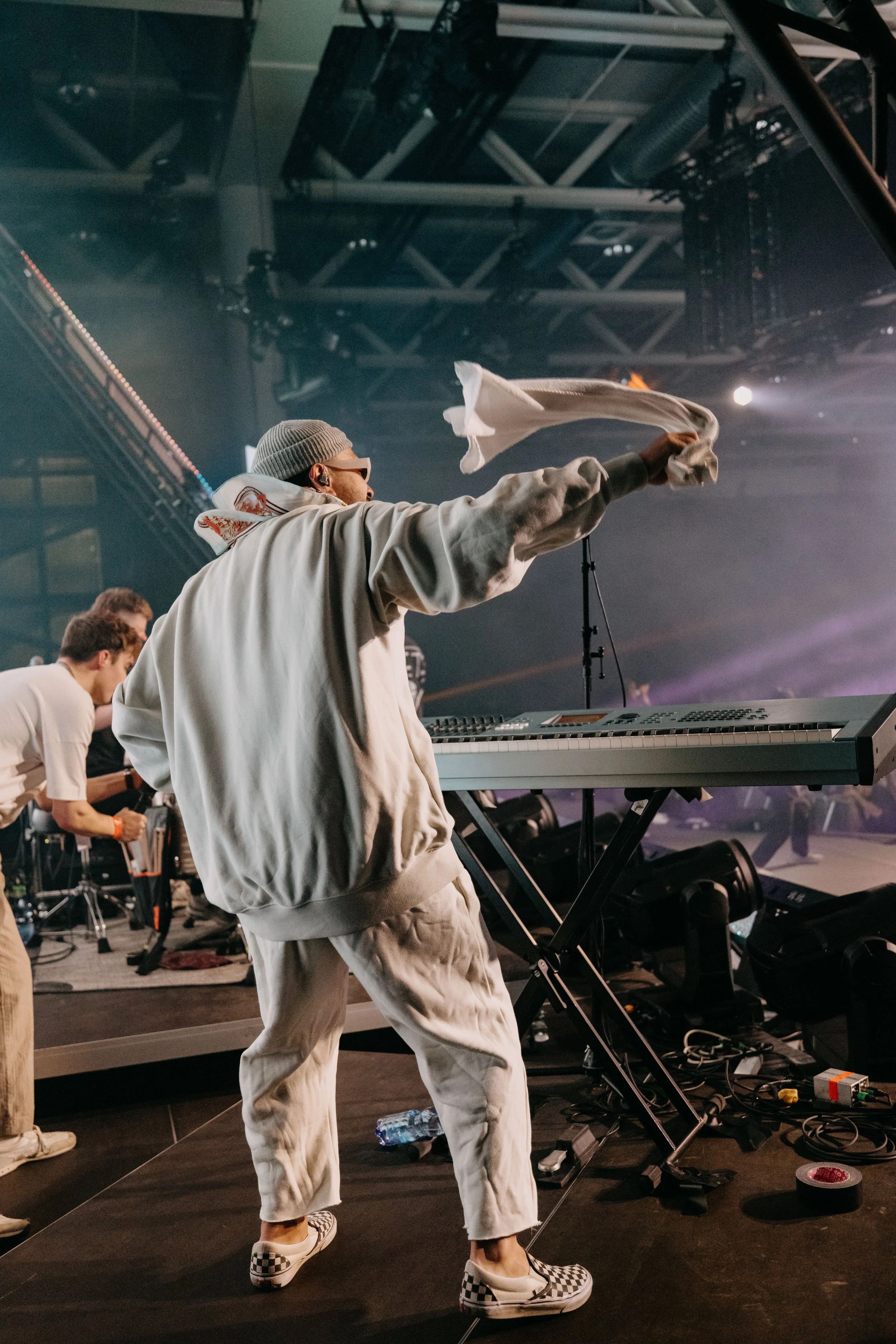 Musiker beim Auftritt, der ein Keyboard spielt und ein Tuch in die Luft wirft, auf einer Bühne mit mehreren Personen im Hintergrund, bei einem Konzert oder einer Veranstaltung.