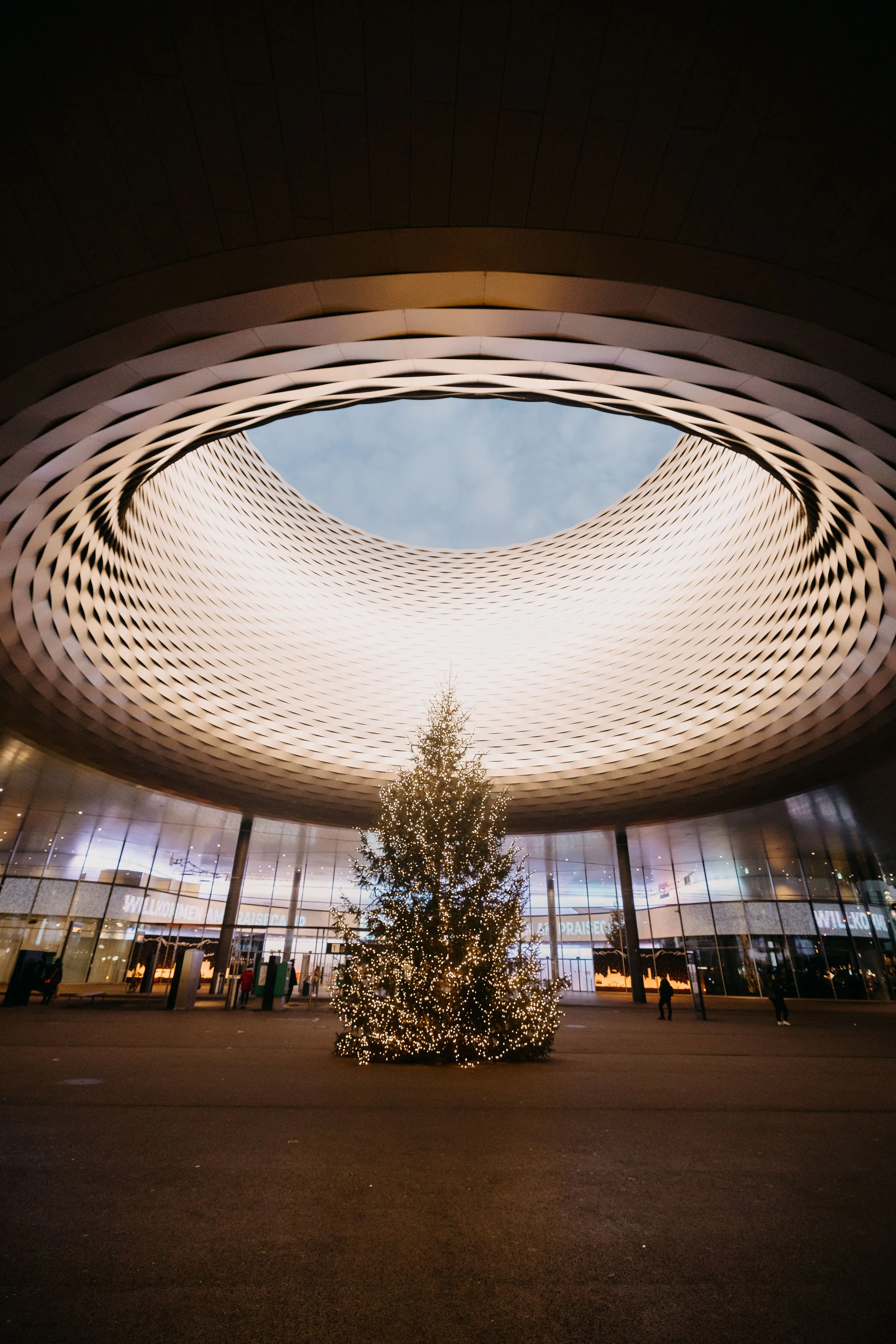 Weihnachtsbaum mit Lichterketten in einem modernen Gebäude mit einer großen, offenen Decke und Blick nach oben zum Himmel.