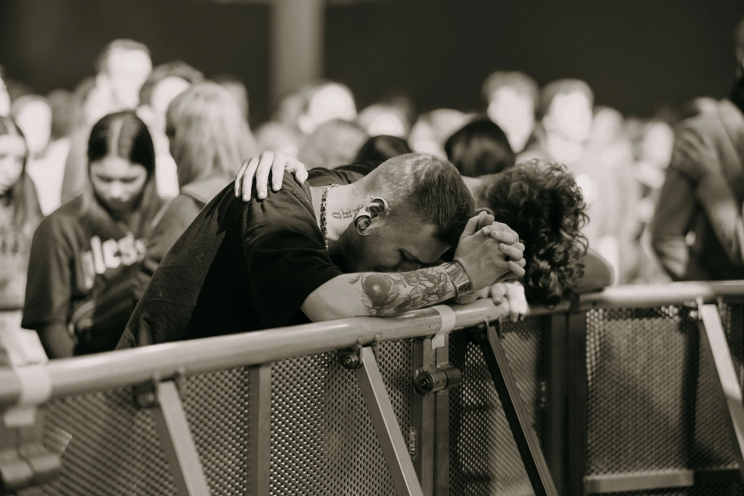 Ein junger Mann mit Tattoos, der auf einem Konzert oder einer Veranstaltung an der Absperrung betet oder betört wirkt, während er die Hände vor seinem Kopf verschränkt. Er trägt ein dunkles T-Shirt und hat einen Irokesenschnitt. Im Hintergrund sind m