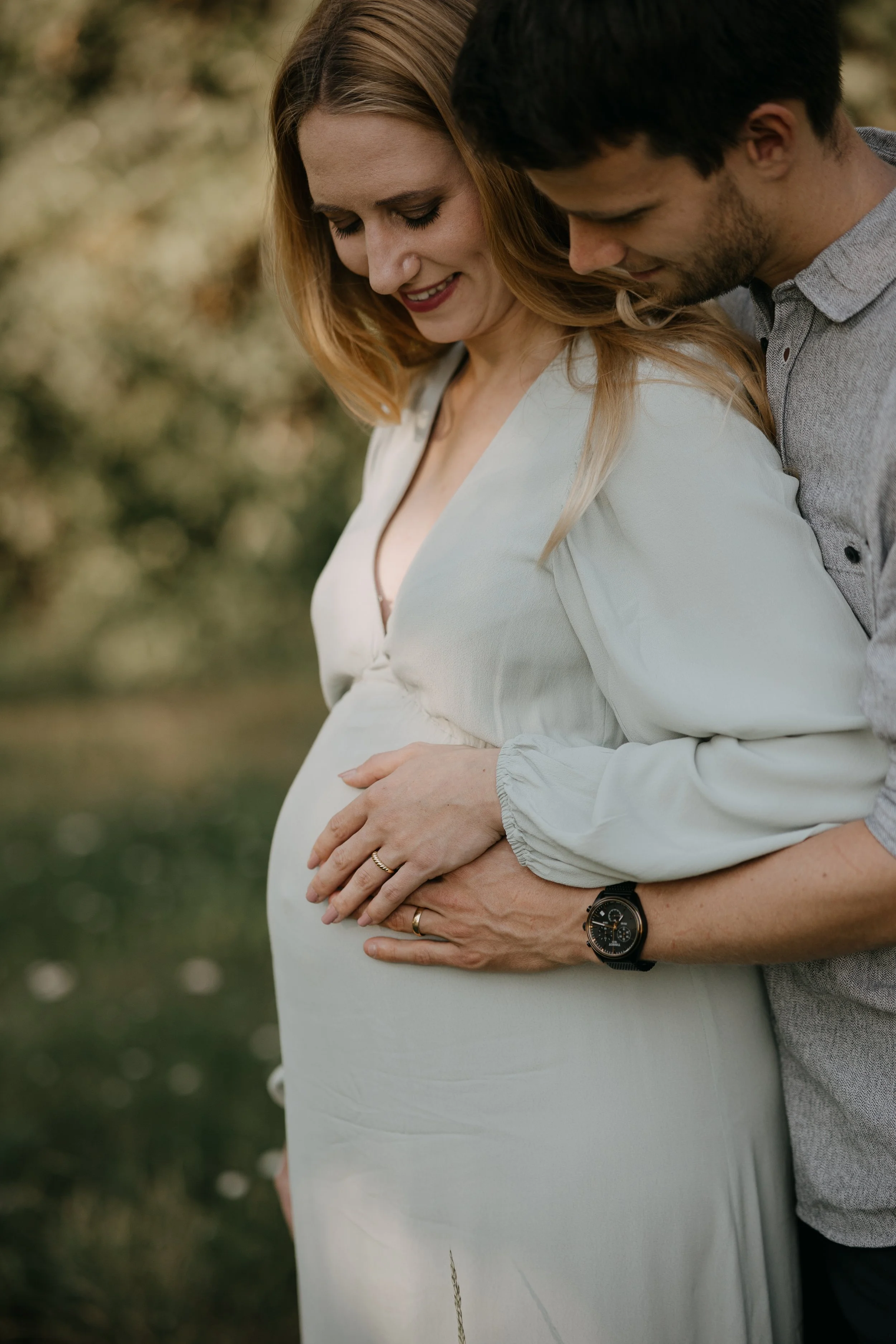 Ein schwangere Frau hält ihre Bauch mit den Händen, während ein Mann sie von hinten umarmt, in einem natürlichen, grünen Außenbereich bei Sonnenuntergang.