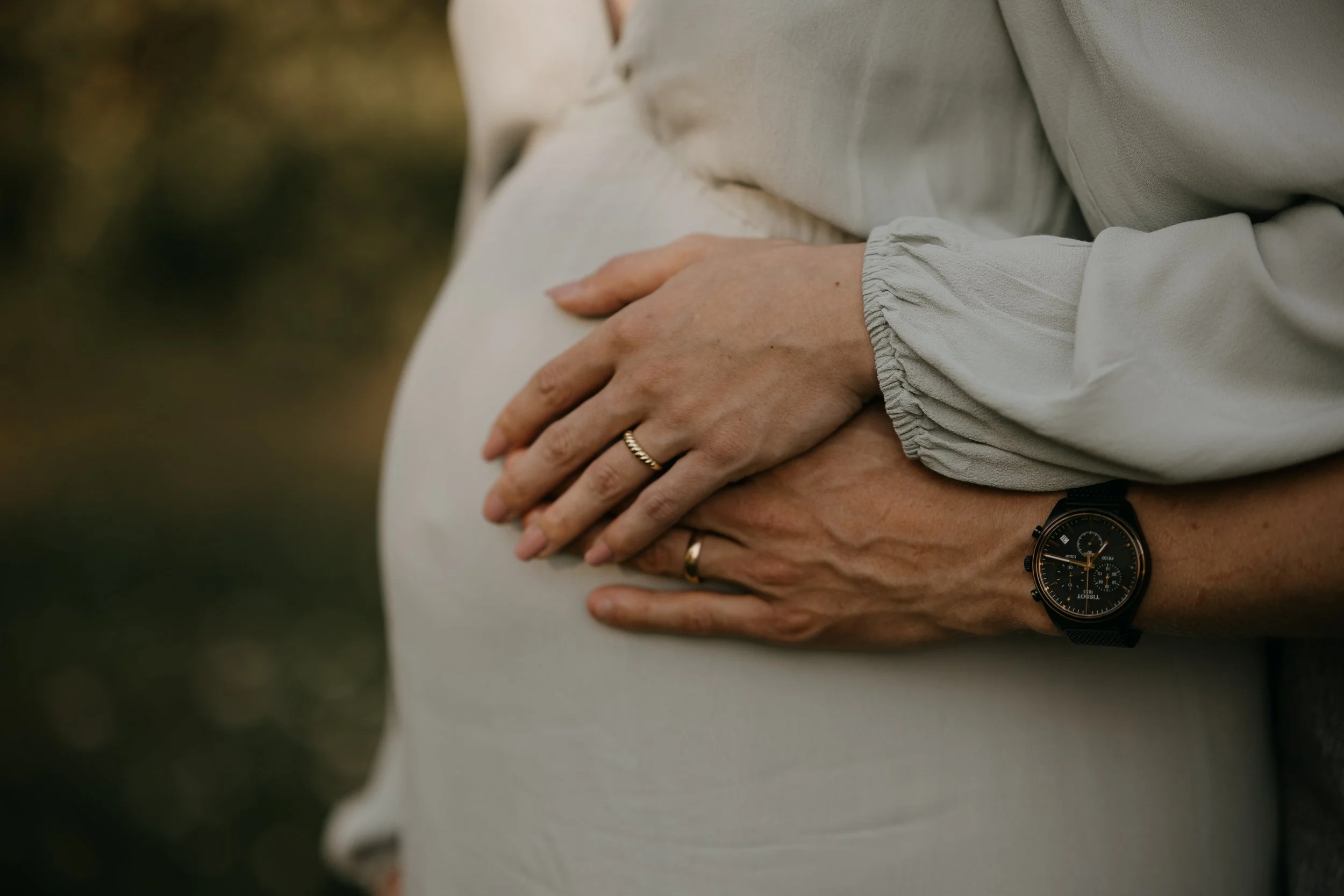 Nahaufnahme von zwei Händen, die auf einen Babybauch liegen, einer trägt eine Armbanduhr und beide haben Ringe, vor unscharfem Naturhintergrund.