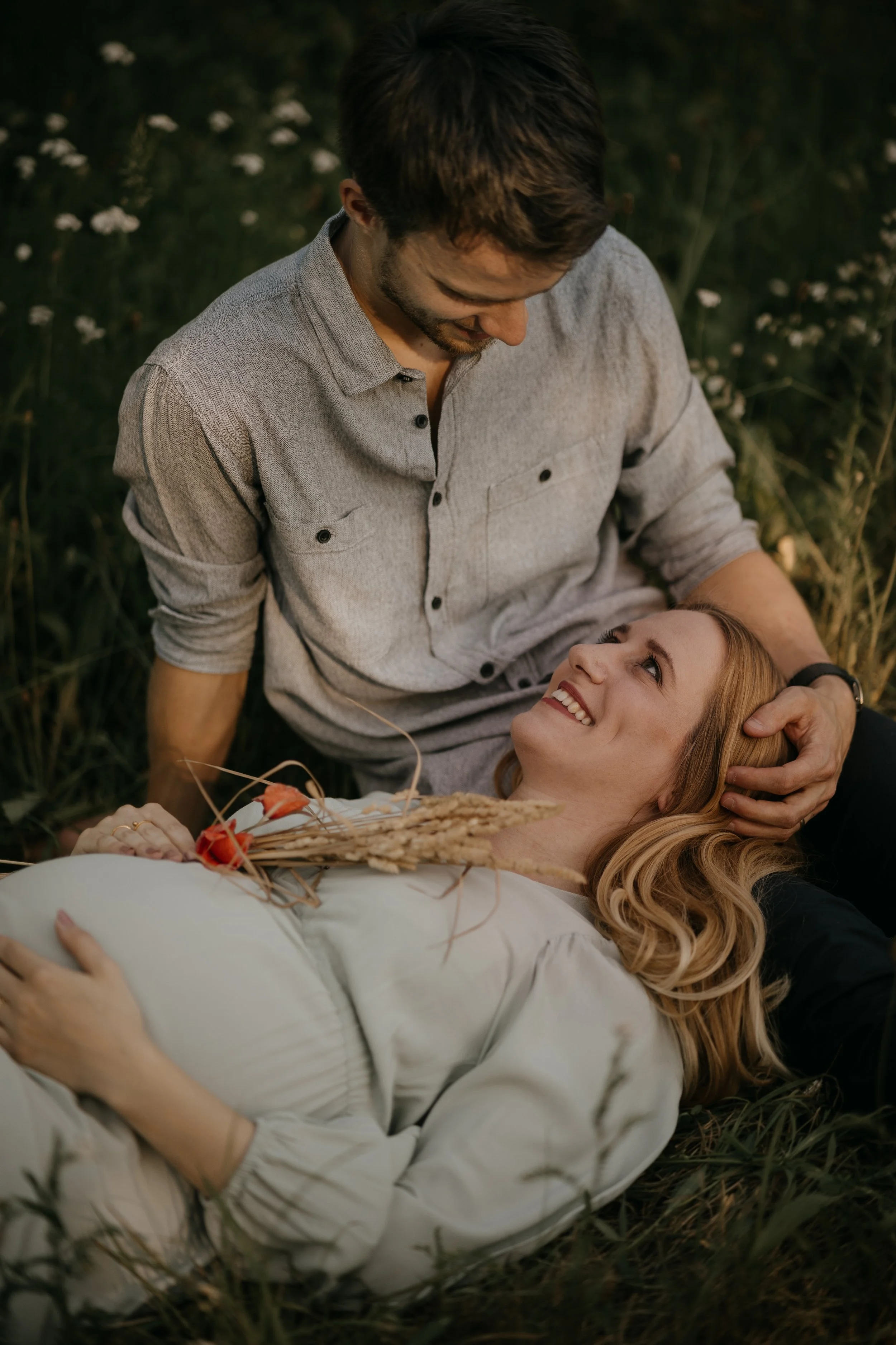 Ein Paar sitzt im Gras auf einer Wiese, sie ist schwanger, er küsst sie und beide lachen glücklich, umgeben von kleinen weißen Blumen, im Hintergrund Bäume und Sonnenlicht im Abend