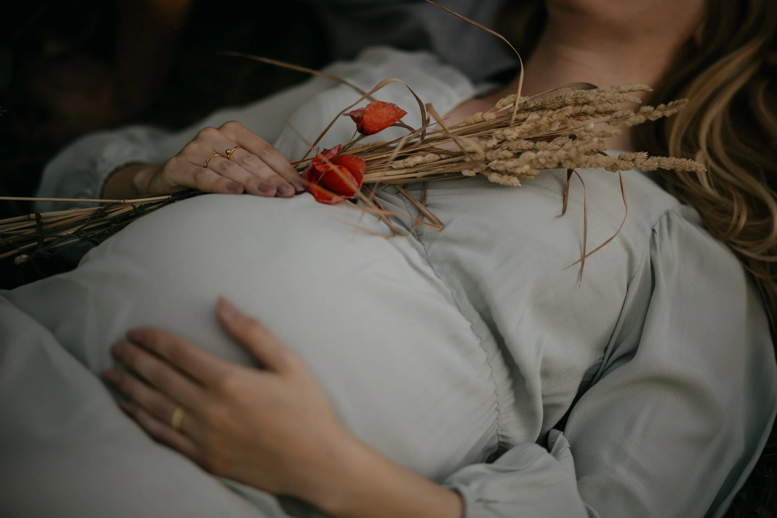Eine schwangere Frau liegt auf dem Rücken, die Hände ruhen auf ihrem Bauch, während sie eine Vase mit getrockneten Blumen hält.