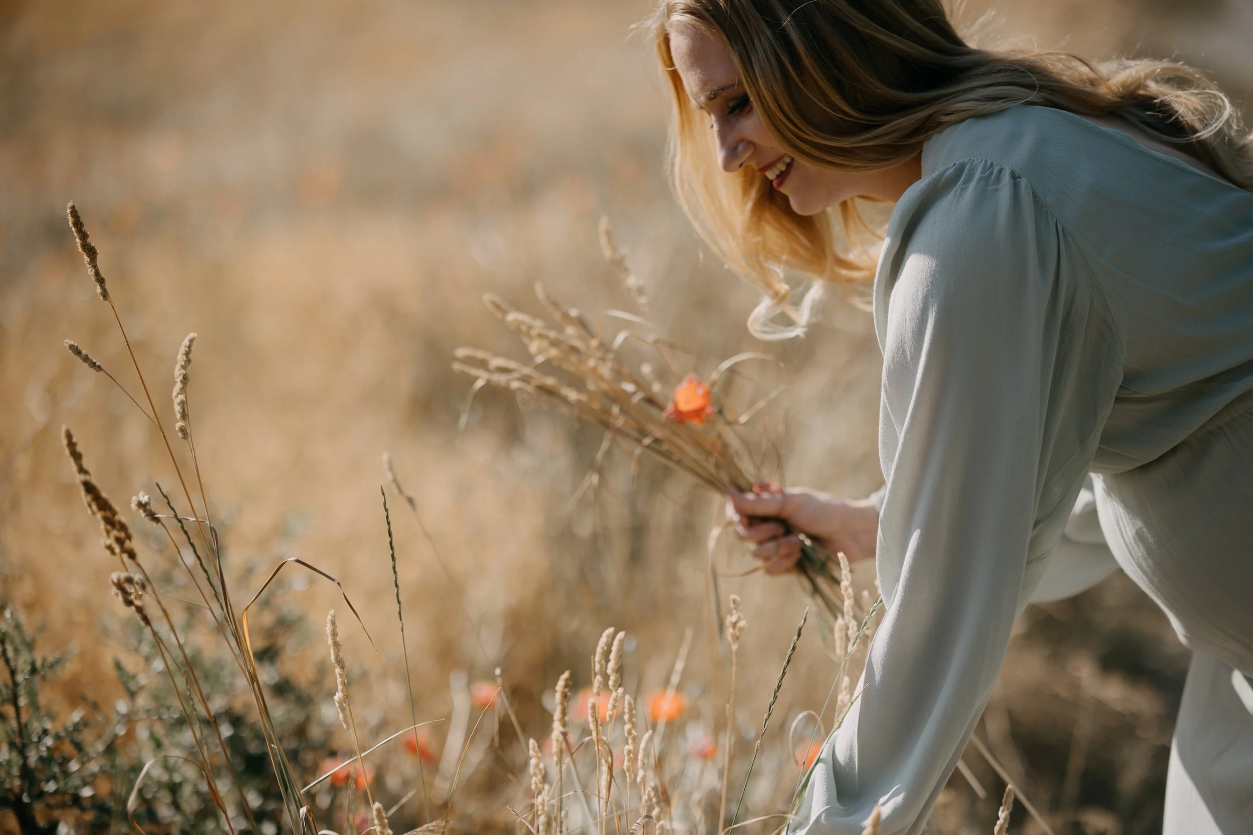 Eine lachende Frau in einem weißen Kleid, die im Halbrund in einem Feld mit Gräsern und Mohnblumen Blumen pflückt.