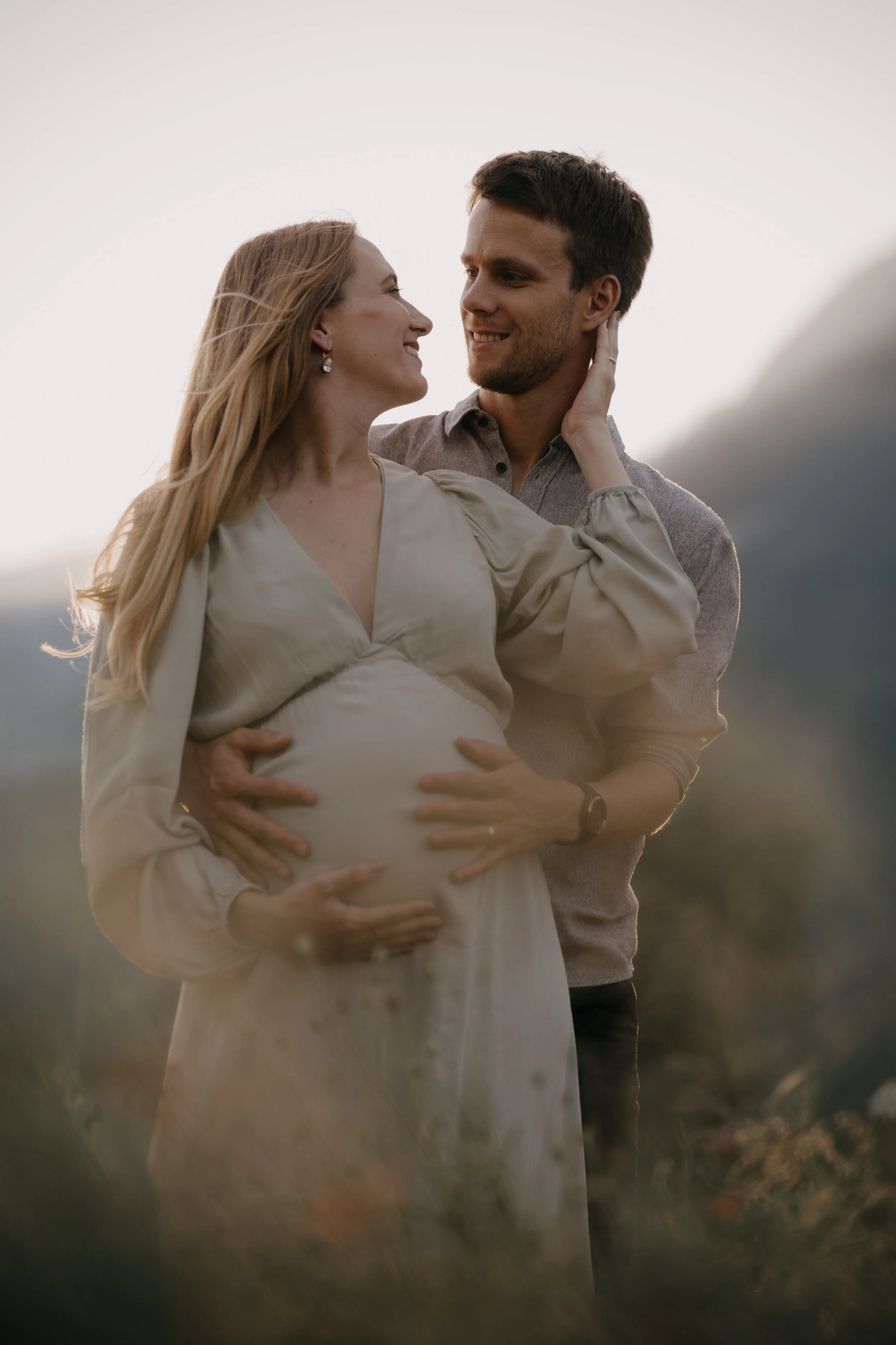 Ein Paar umarmt sich liebevoll im Freien, die schwangere Frau trägt ein helles Kleid, während der Mann sie hält und in die Augen schaut, im Hintergrund eine Naturkulisse bei Sonnenuntergang.
