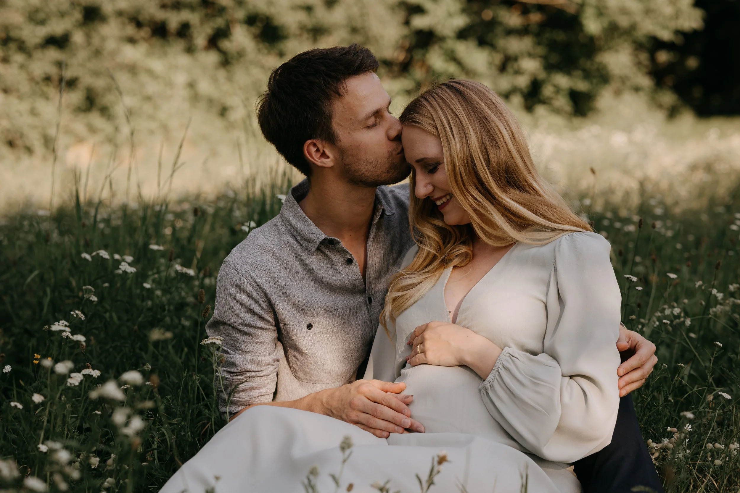 Ein Paar sitzt in einem Wiesenfeld, der Mann küsst die schwangere Frau auf die Stirn, beide lachen glücklich.
