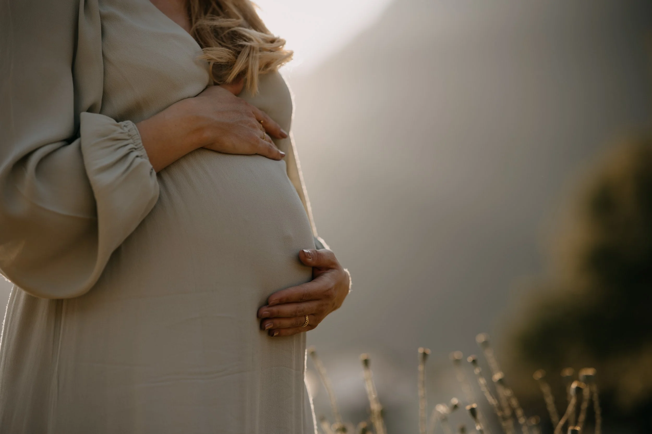 Eine schwangere Frau hält ihre Hände auf den Bauch, während sie im Freien steht. Die Szene ist in warmes Licht getaucht.