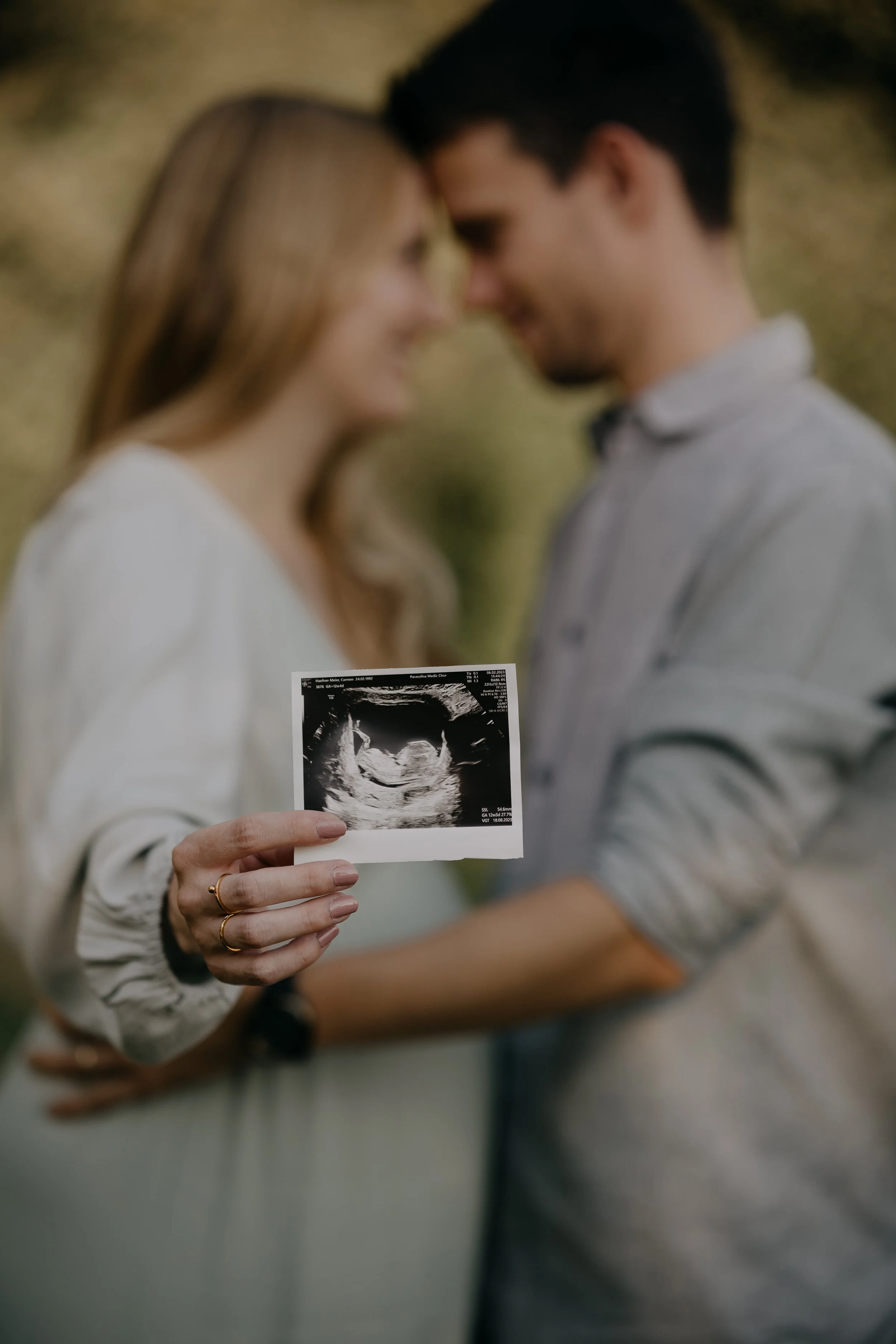 Ein Paar hält einen Ultraschallbild des ungeborenen Kindes, während sie sich nahe kommen, im Hintergrund unscharf ein lachendes Paar bei Sonnenuntergang im Freien
