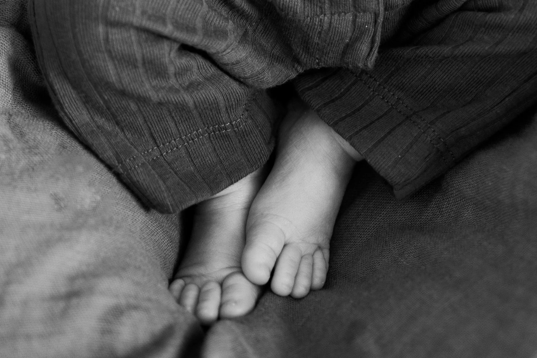 Nahaufnahme eines Kinderarms und einer Kinderhand, die sich halten, auf einer weichen Oberfläche, in Schwarz-Weiß.