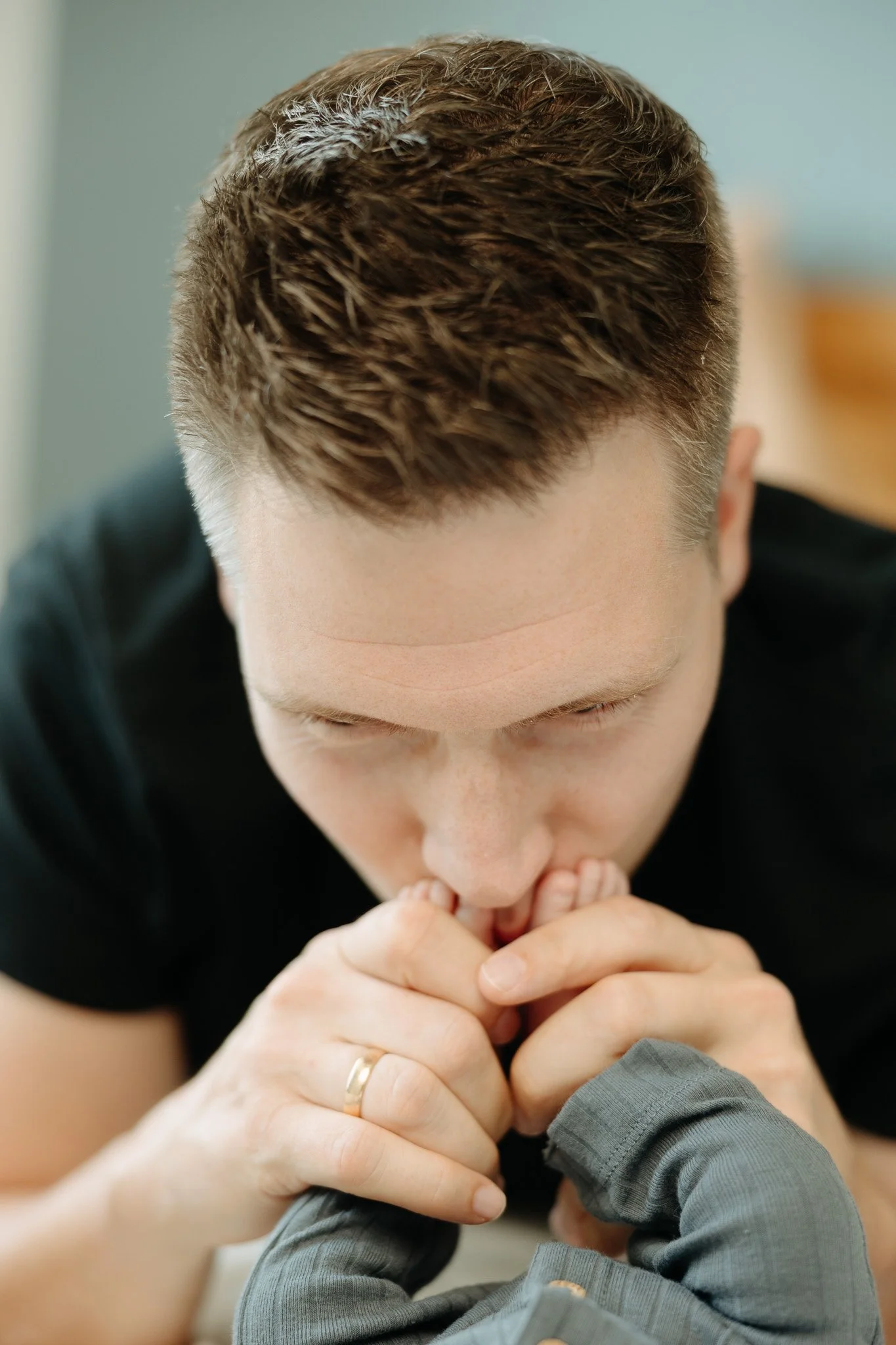 Ein Mann mit braunem Kurzhaarschnitt küsst sanft die Füße eines Babys.