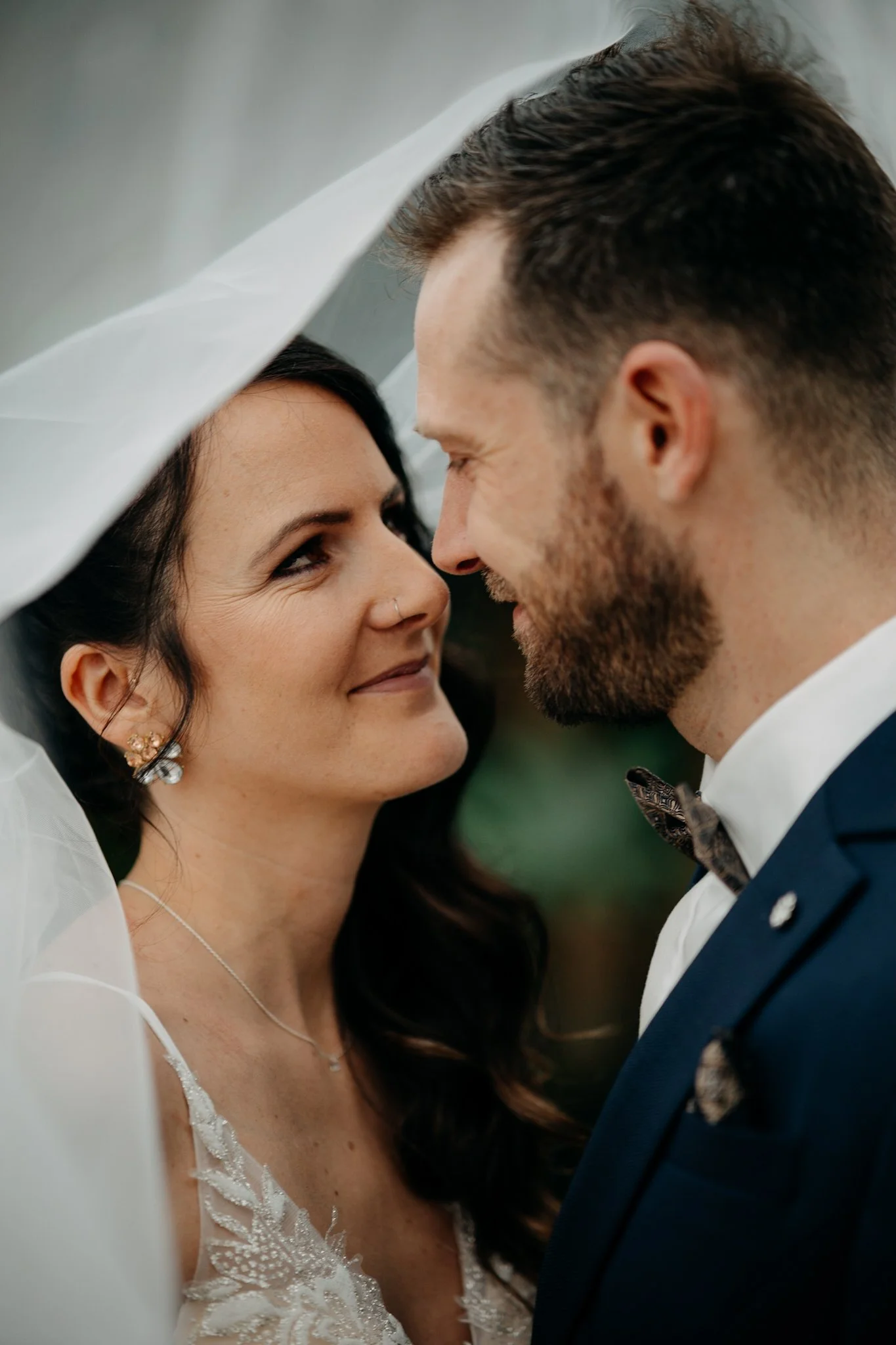 Ein Paar bei einer Hochzeitszeremonie, das sich unter einem weißen Schleier anlächelt.