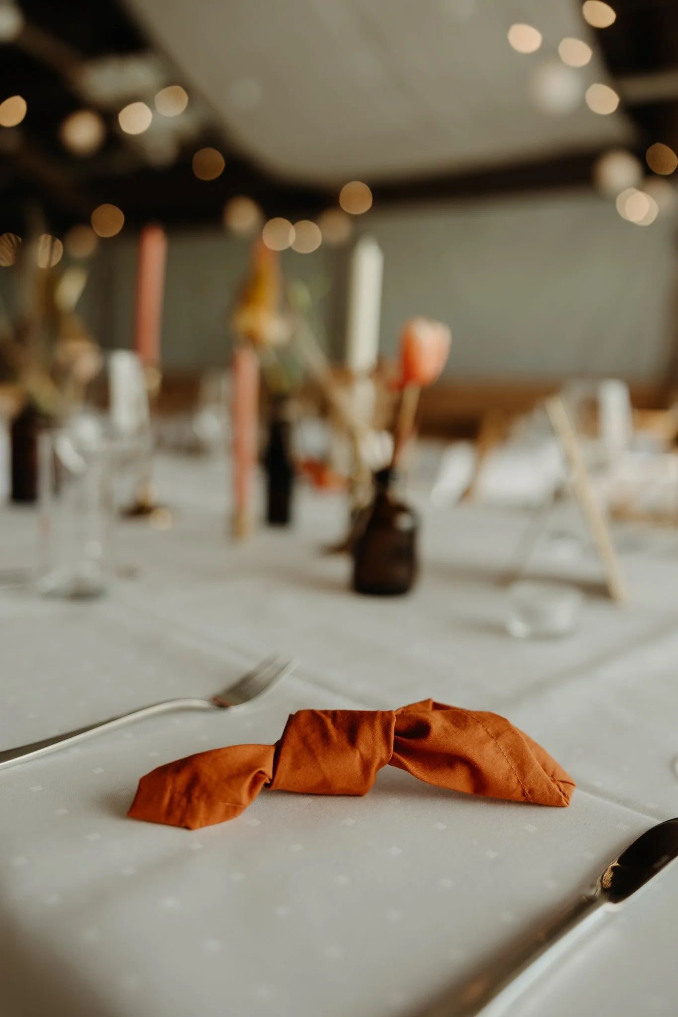 Ein gedeckter Tisch mit einem braunen Stoffservietten in der Mitte, Besteck an den Seiten, im Hintergrund Kerzen und Dekorationsgegenstände, unscharf beleuchteter Raum.