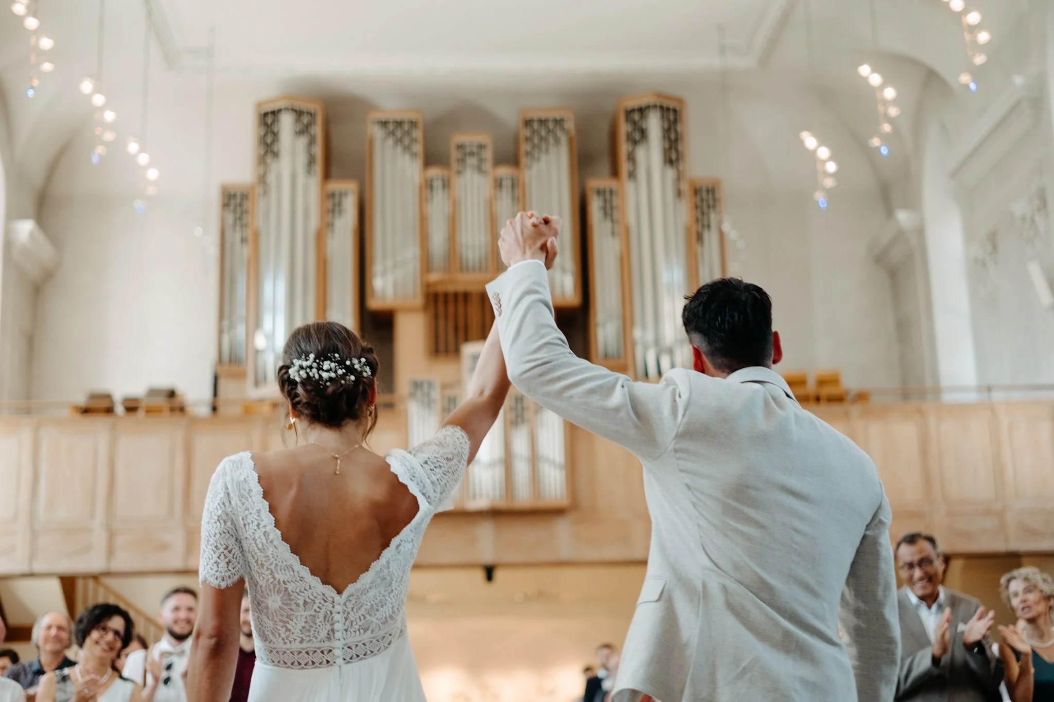 Ein frisch vermähltes Paar tanzt in einer Kirche, umgeben von applaudierenden Gästen, im Hintergrund eine große Orgel.