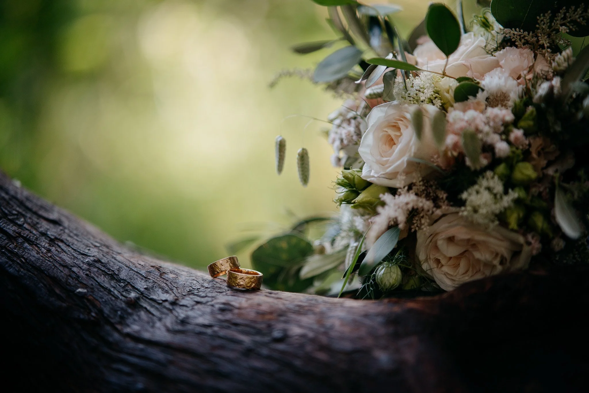 Zwei goldene Eheringe auf einem Baumstamm, daneben ein Brautstrauß mit weißen Rosen und grünem Laub, im Hintergrund unscharfer grüner Naturhintergrund.