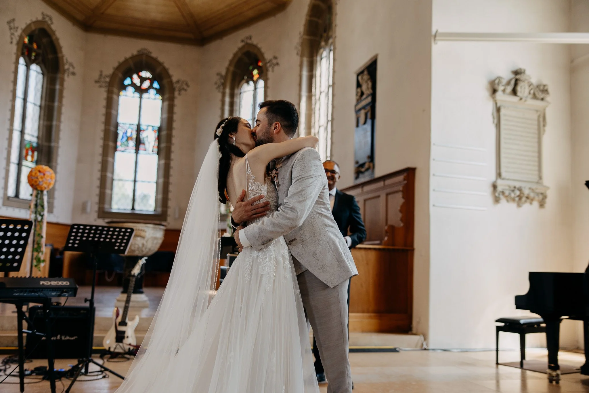 Braut und Bräutigam küssen sich in einer Kirche während ihrer Hochzeit, im Hintergrund Musiker und Kirchenfenster mit buntem Glas.