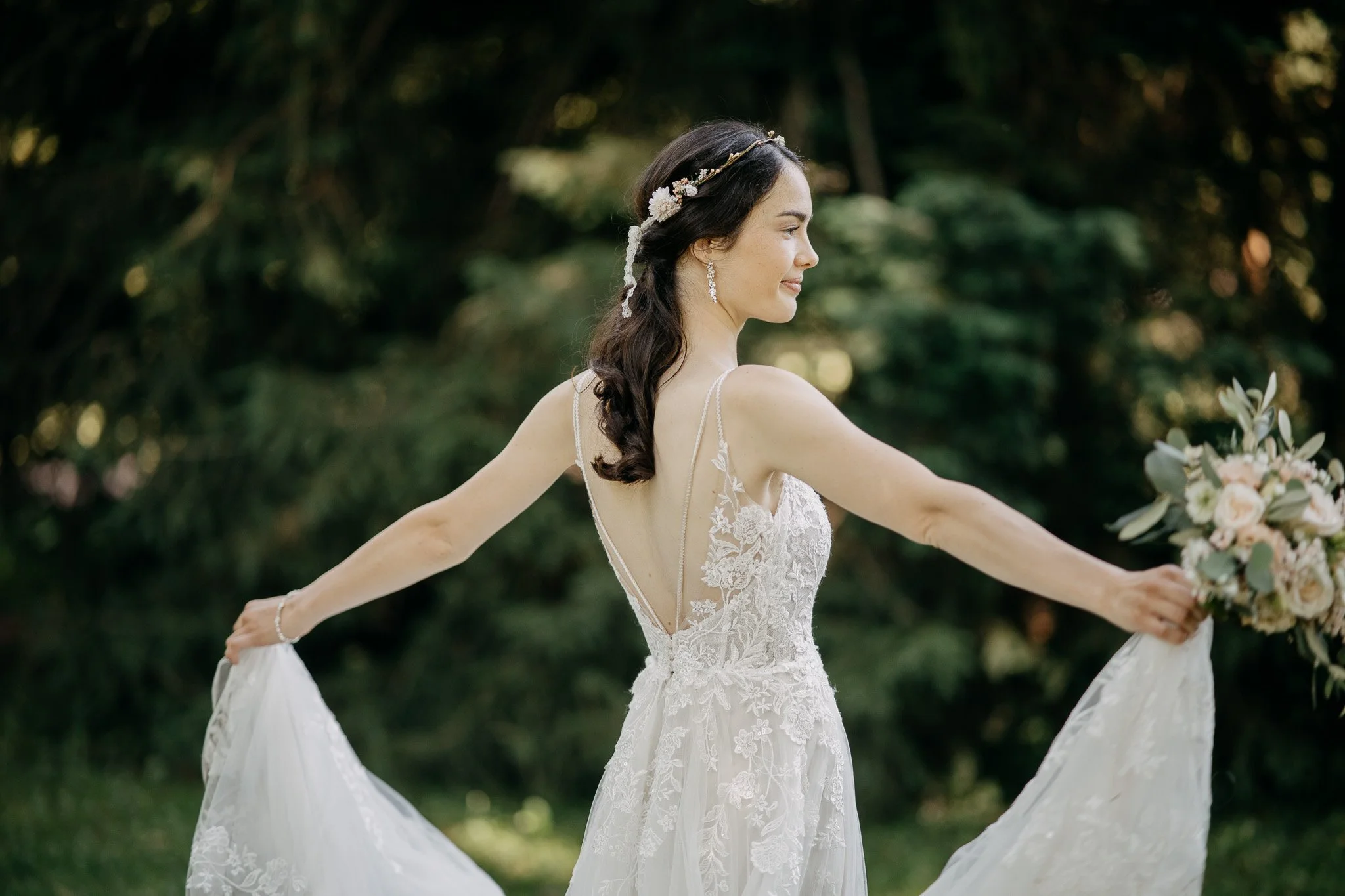 Eine Braut in einem weißen, eleganten Brautkleid steht im Freien mit grüner, bewaldeter Umgebung im Hintergrund, während sie ihr Kleid hält.