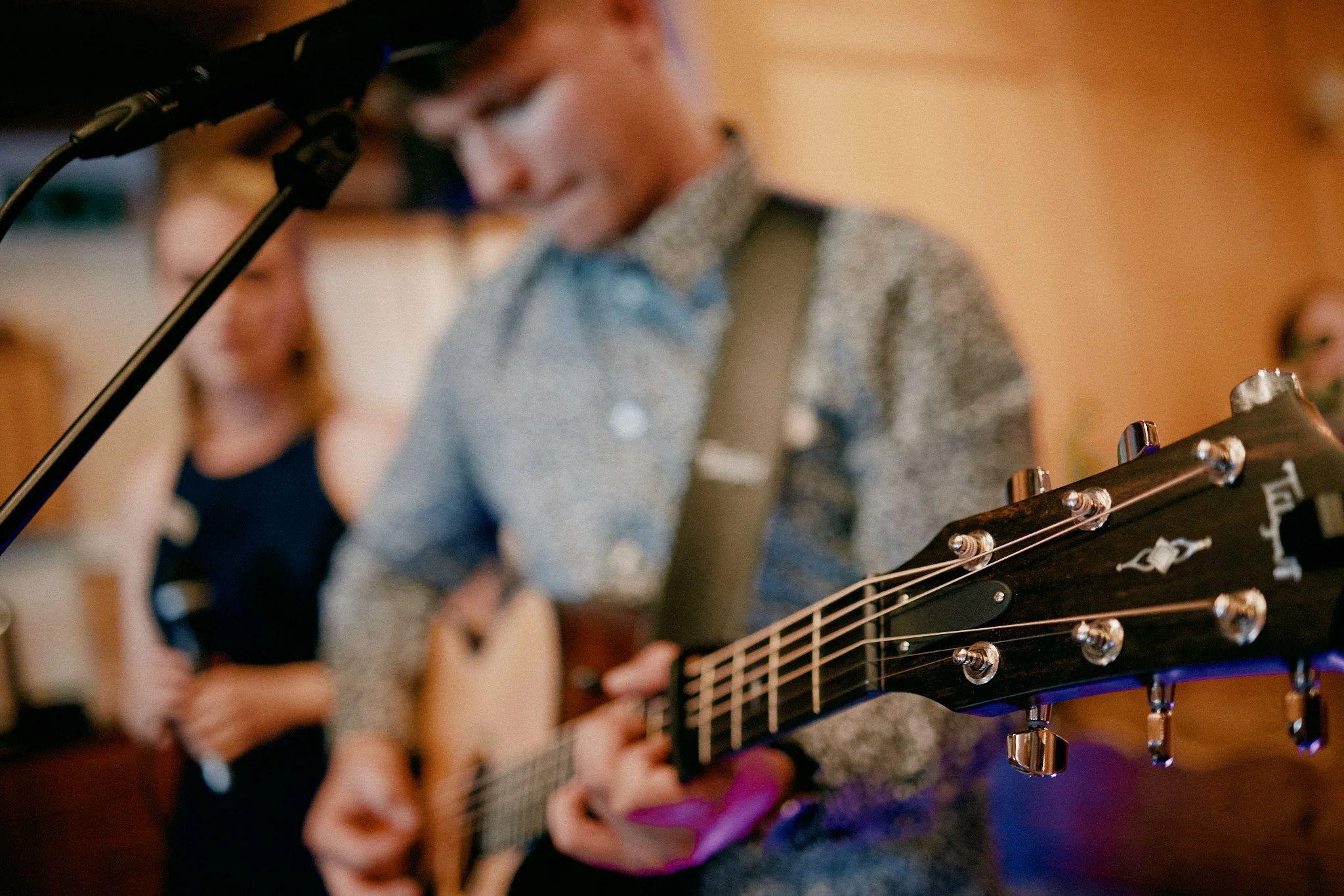 Musiker spielt Gitarre bei einer Veranstaltung, im Hintergrund eine weitere Person.