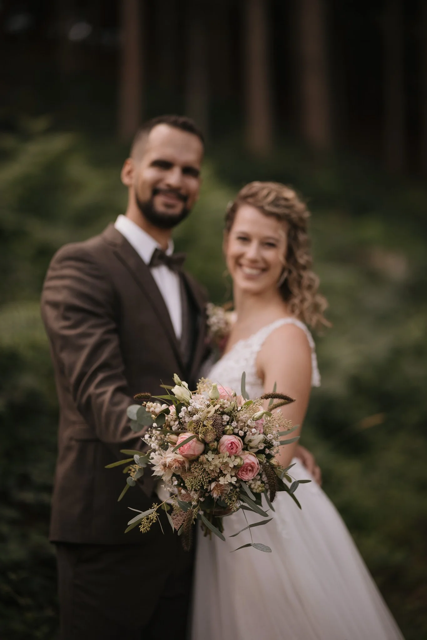 Braut und Bräutigam bei einer Hochzeit im Freien, der Bräutigam hält einen Blumenstrauß.