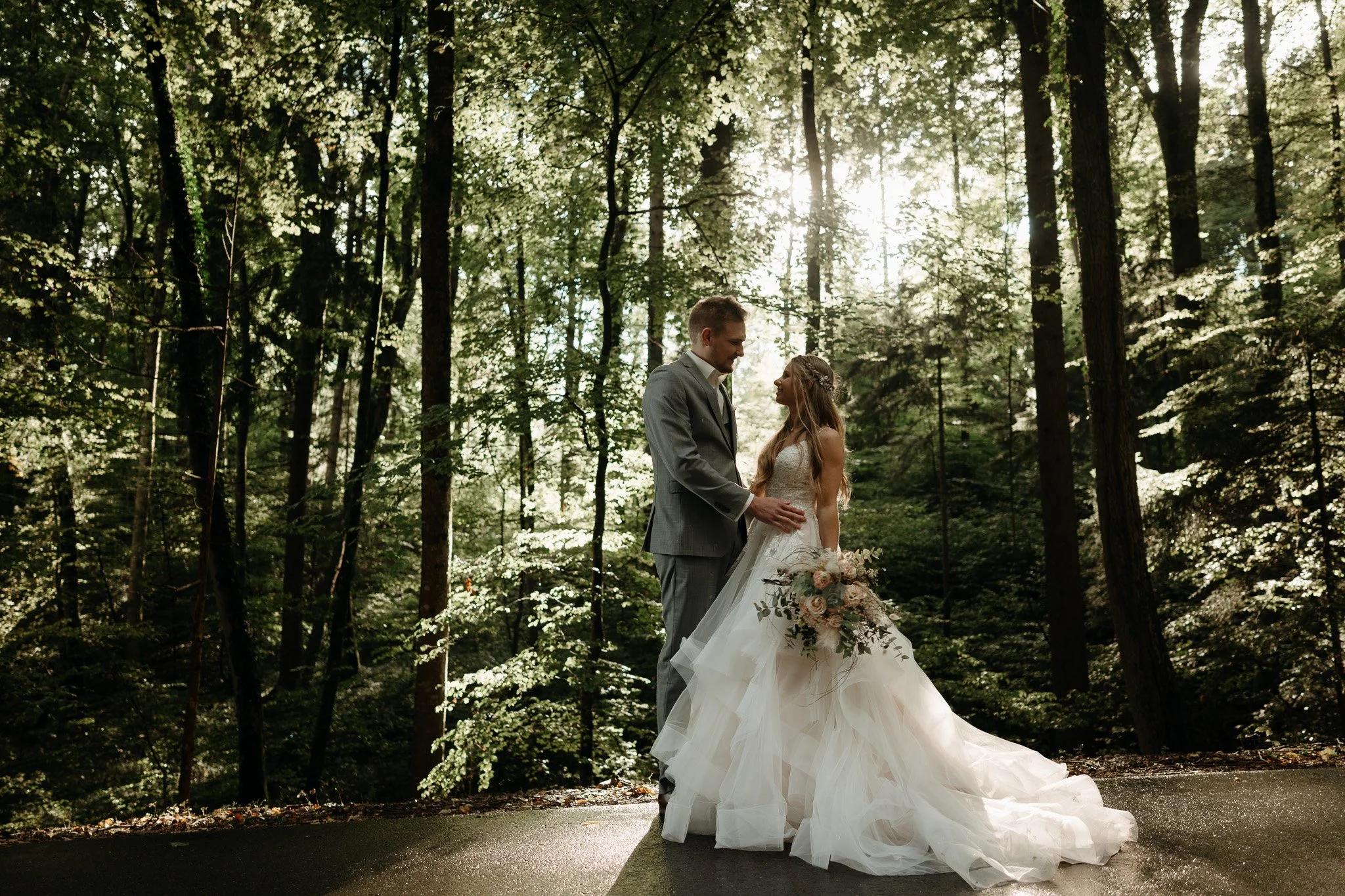 Ein Brautpaar steht in einem Wald, Sonnenlicht scheint durch die Bäume, die Braut trägt ein langes weißes Kleid und hält einen Blumenstrauß, der Bräutigam trägt einen grauen Anzug.