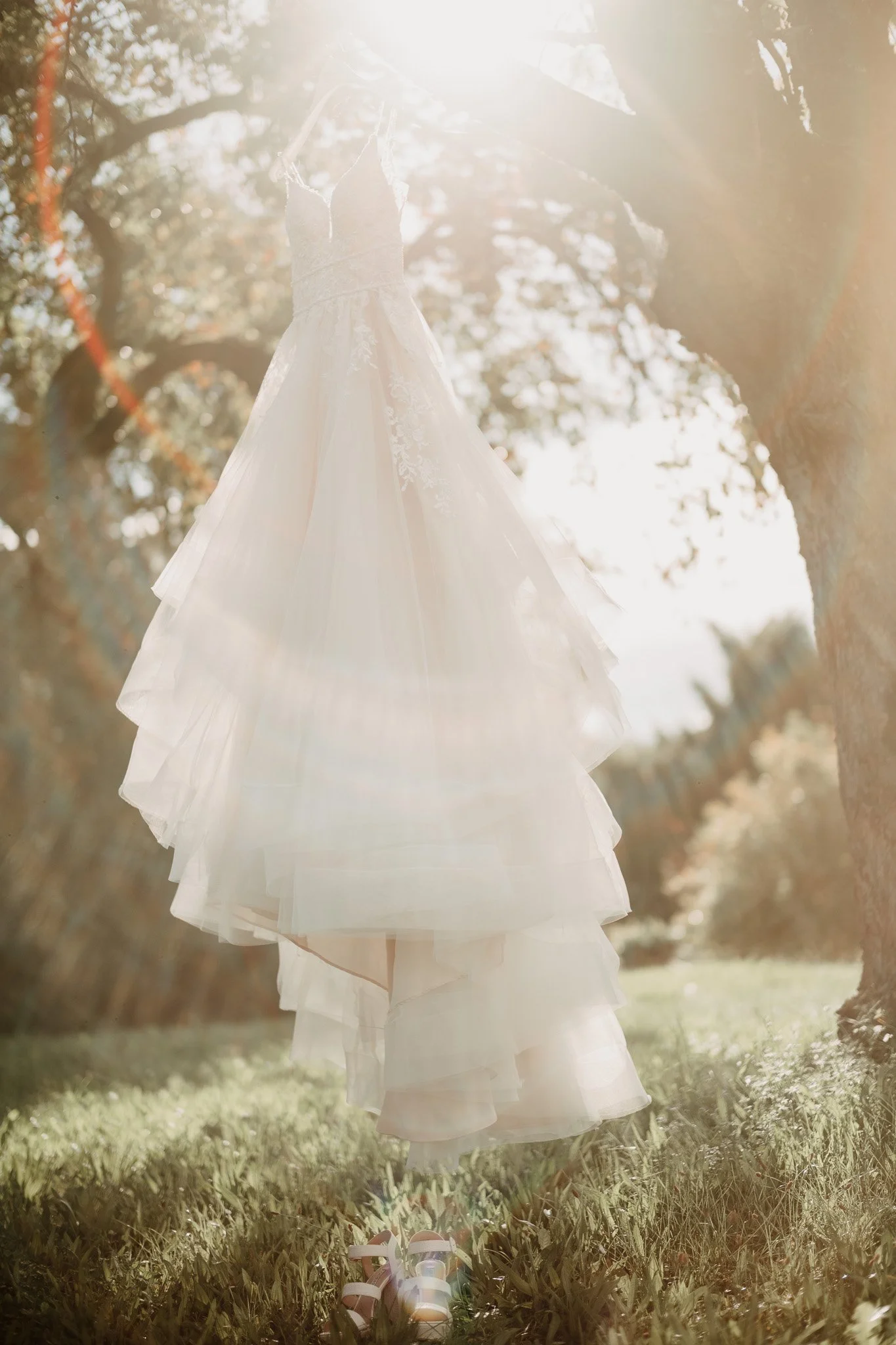 Ein weißes Hochzeitskleid hängt an einem Baum im Sonnenlicht, darunter liegt ein Paar Sandalen auf dem Gras, im Hintergrund Bäume und Sonnenschein.