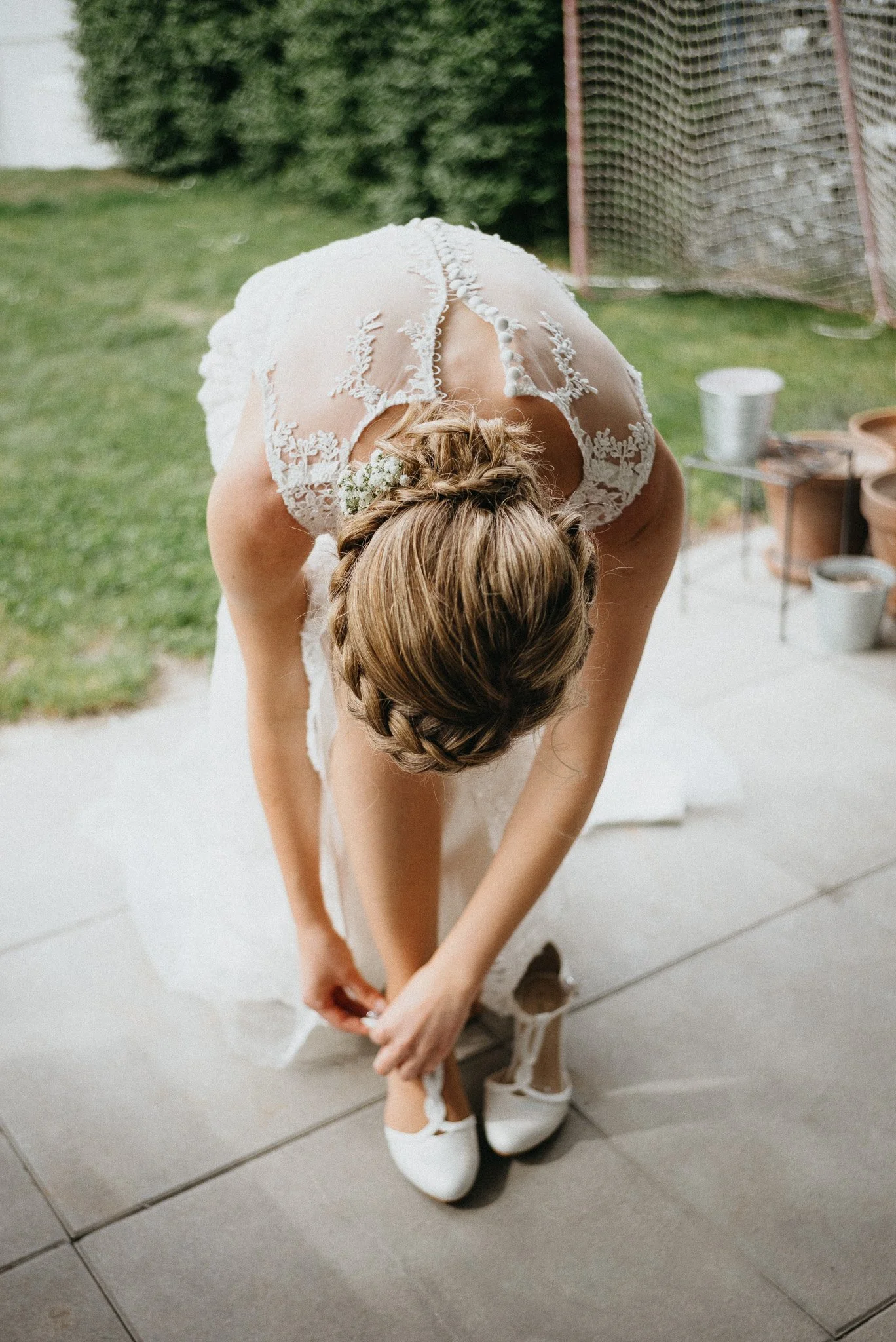Eine Braut in Hochzeitskleid steckt ihre Schuhe an, steht auf einer Terrasse im Freien, umgeben von grünem Garten.