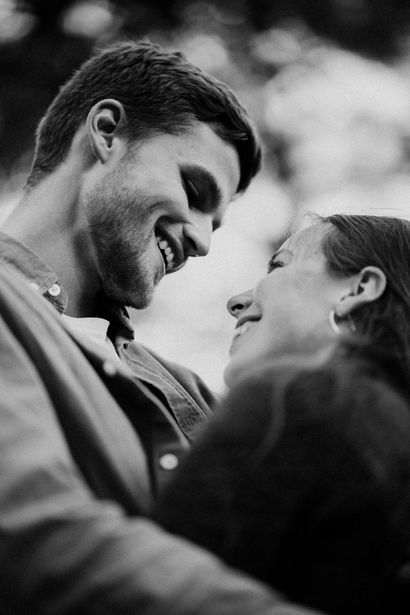 Ein glückliches Paar in einem Close-up, das sich liebevoll ansieht, im Freien bei Sonnenuntergang, in Schwarz-Weiß aufgenommen.