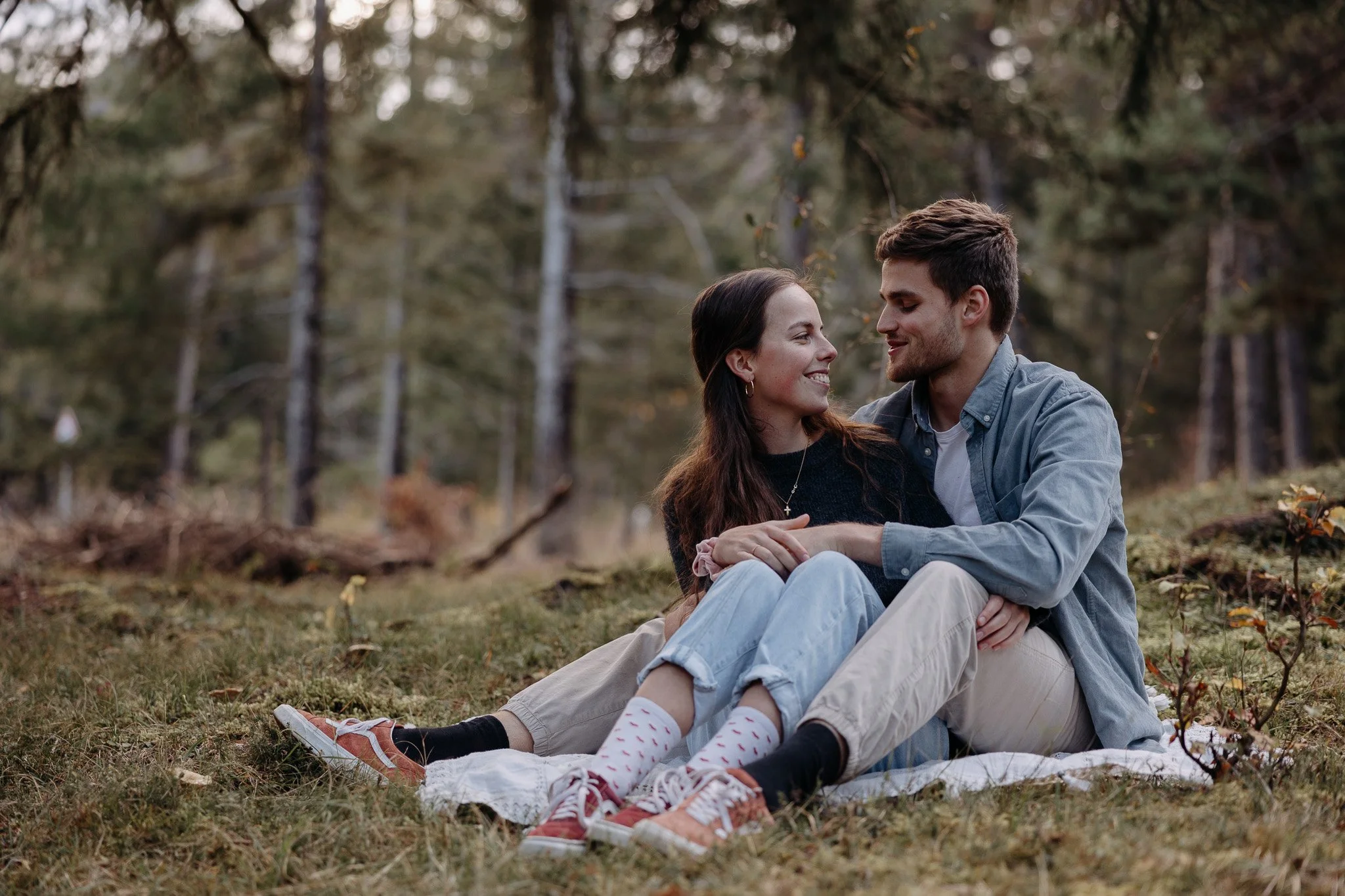 Ein Paar sitzt zusammen auf einer Decke im Wald, lächelnd und sich liebevoll betrachtend.